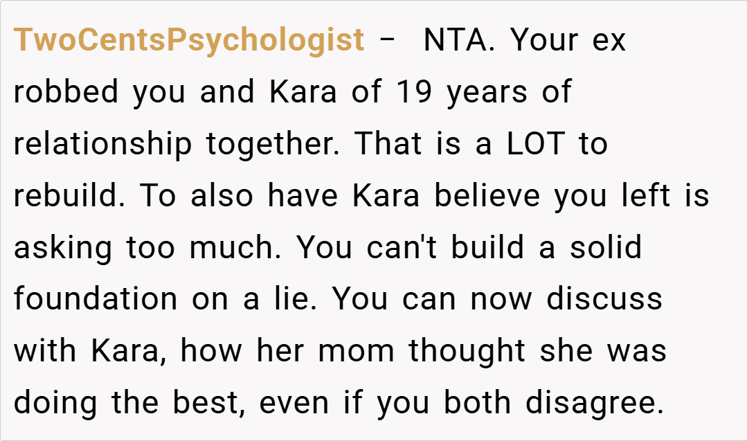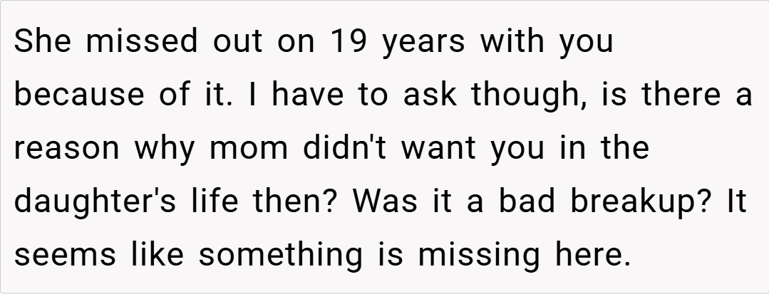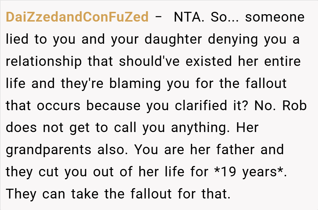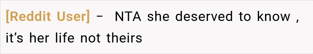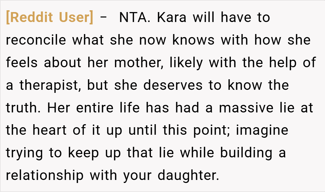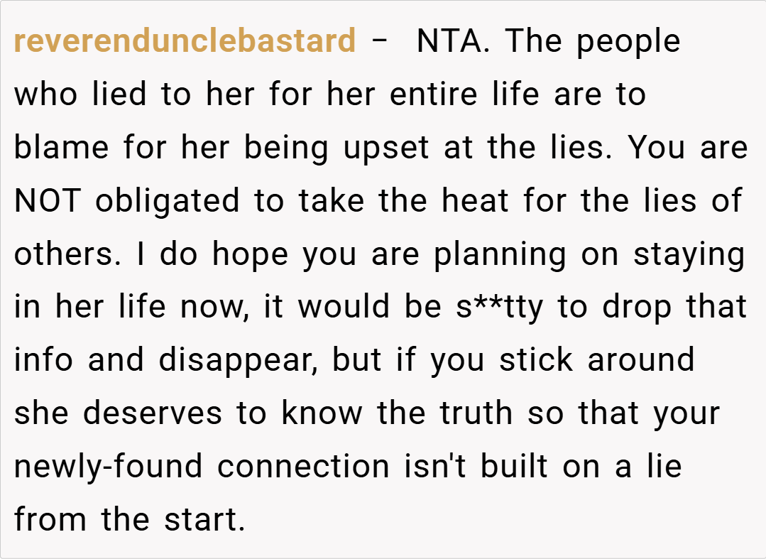 Several redditors expressed strong support for your decision. One user commented, “If you’ve been kept in the dark for so long and finally get a chance to be part of your daughter’s life, you deserve to be honest about what happened. She has a right to know the truth.” Another shared, “It’s painful, but sometimes the truth—no matter how harsh—can be the first step towards healing. You weren’t trying to hurt her; you just wanted to finally be there for her.”