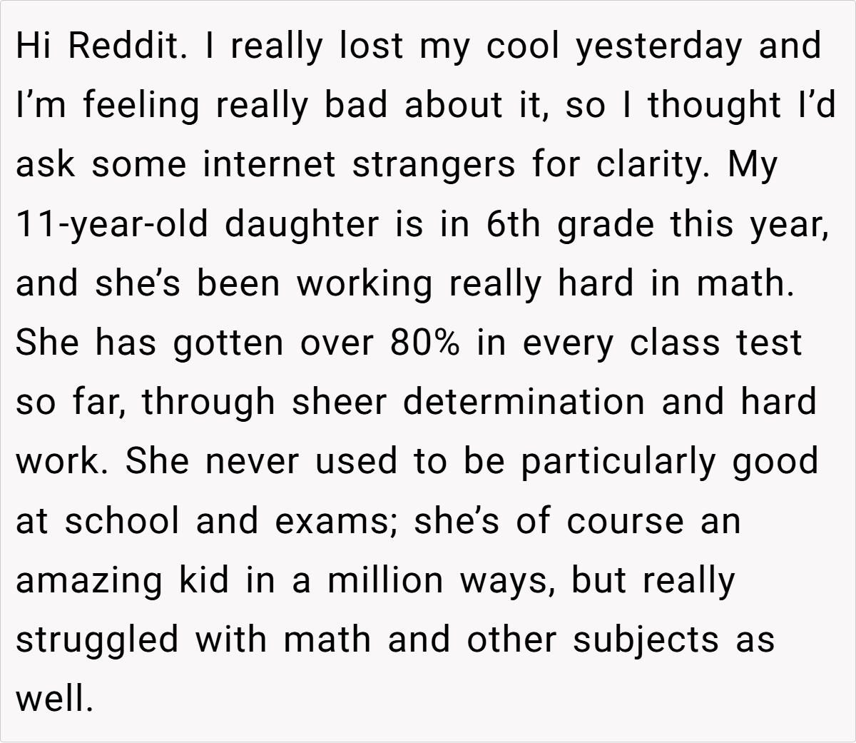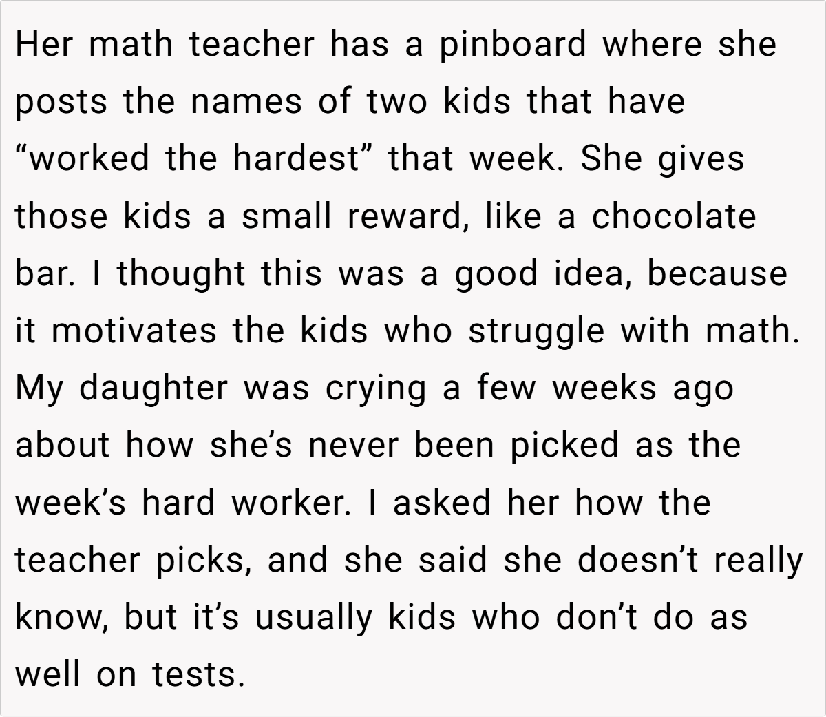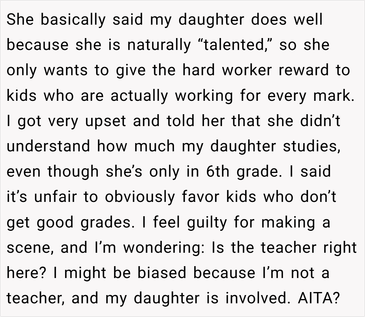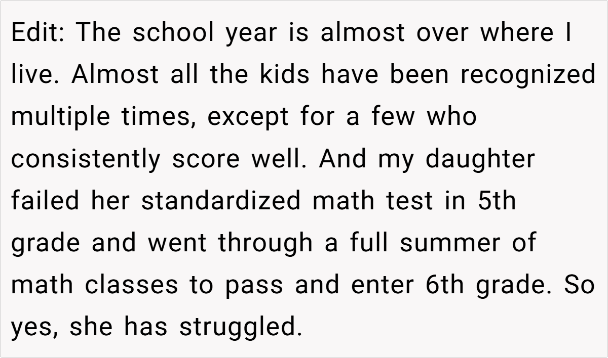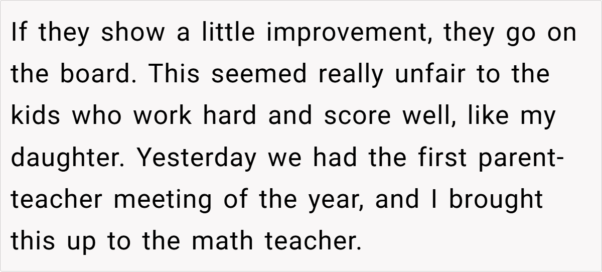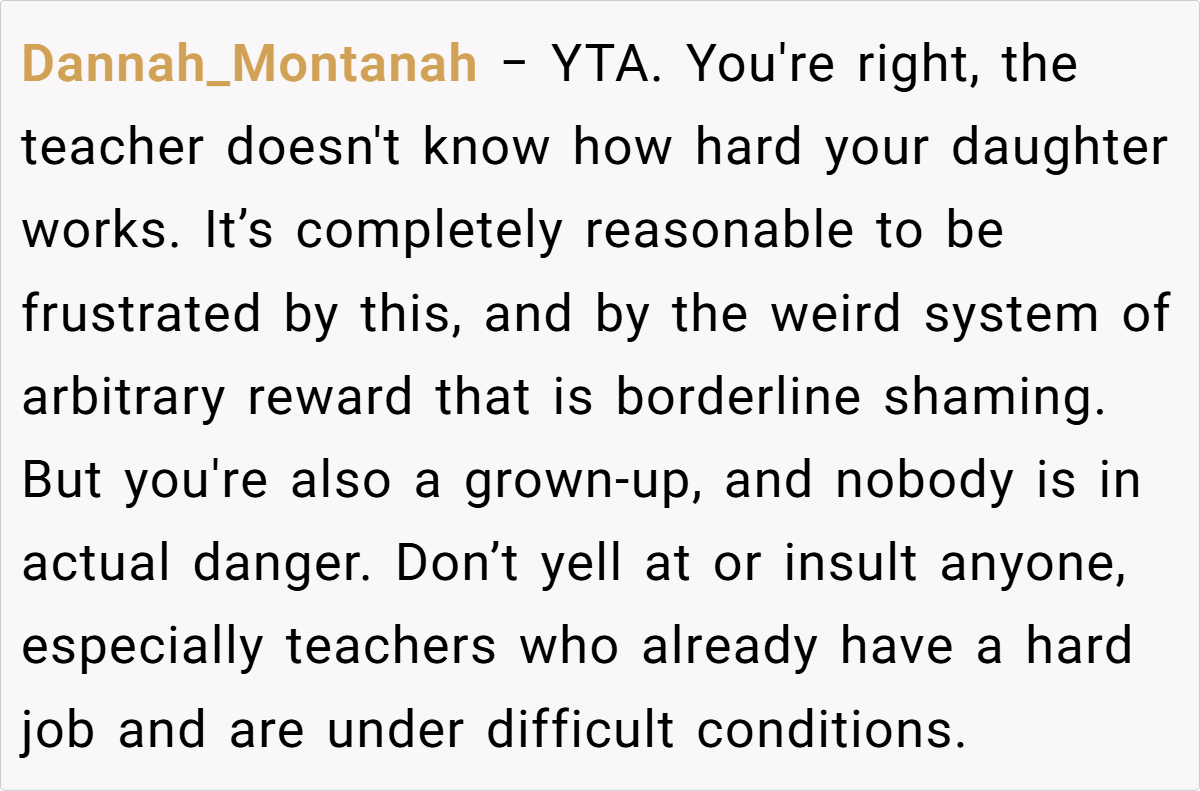 The original AITA post details a mother’s clash with her daughter’s math teacher over a classroom incentive program. While the teacher reserves rewards for students who show improvement, the poster argues that her daughter—who overcame significant academic struggles to consistently score over 80%—deserves equal acknowledgment. The confrontation escalates, leaving the parent guilt-ridden and questioning her actions.