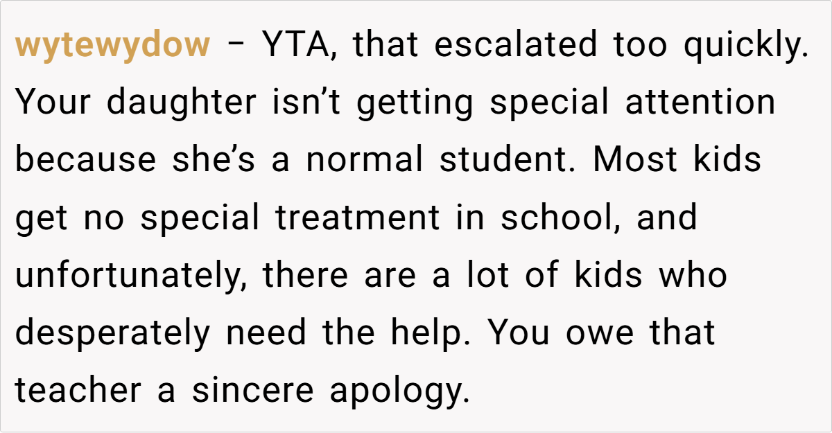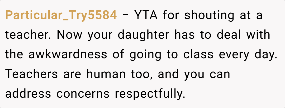 - YTA for confrontational behavior: Most agreed the parent’s reaction was disproportionate and harmful to the teacher-student dynamic.