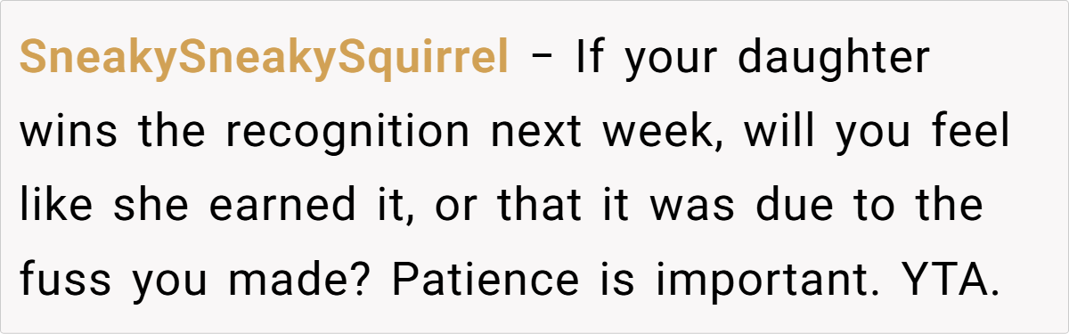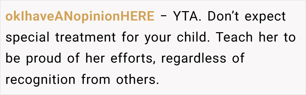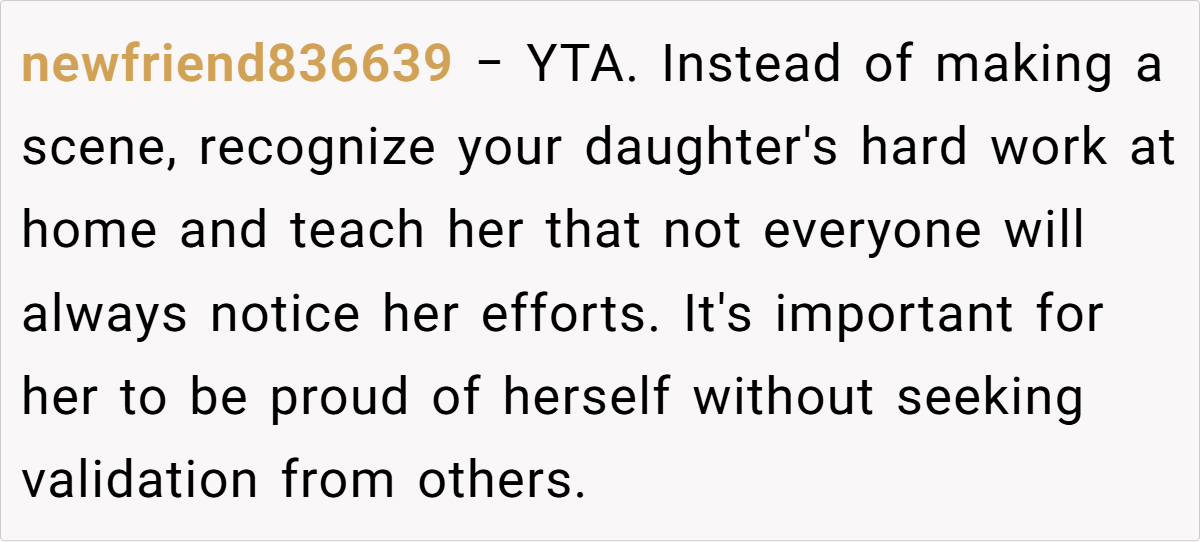 - Home reinforcement suggested: Commenters urged the parent to celebrate her daughter’s achievements independently.