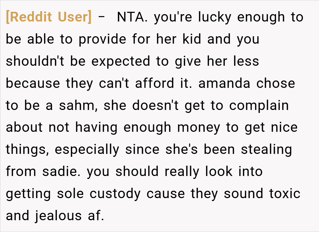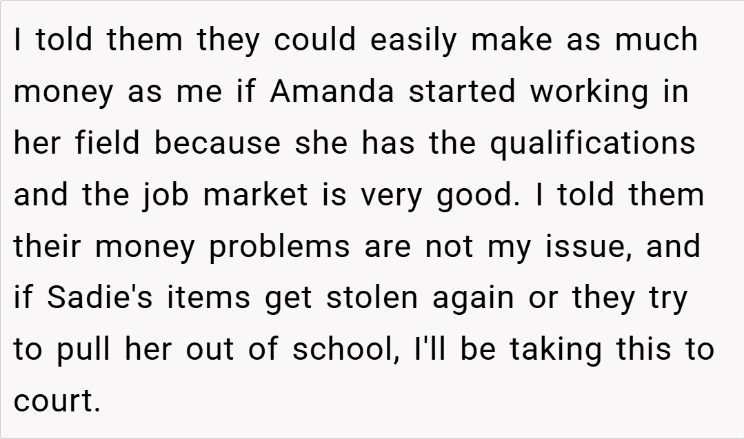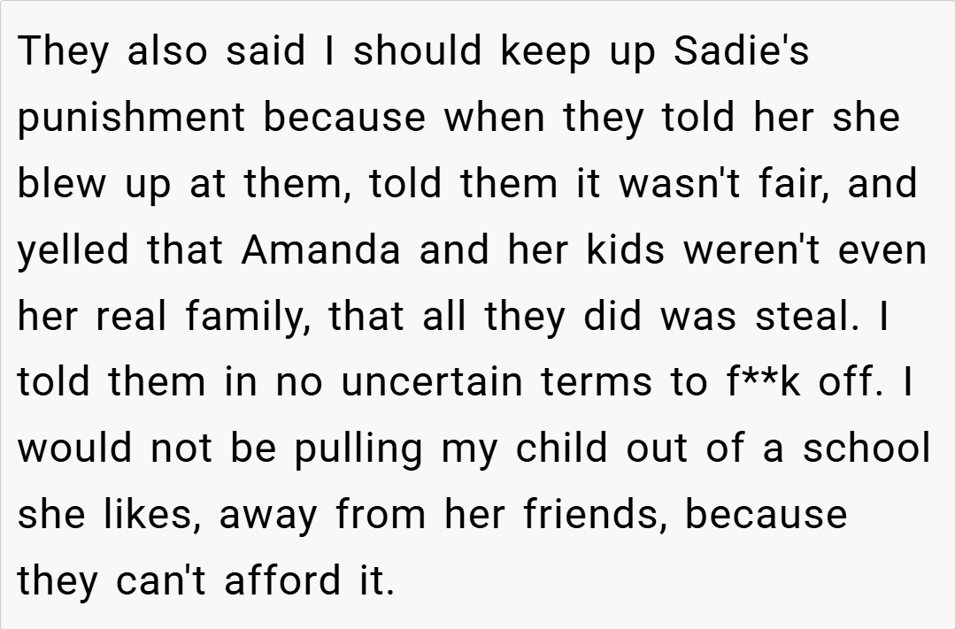 Amanda’s snagging Sadie’s stuff and pushing to yank her from private school? That’s not parenting—it’s sabotage. I get it, blended families are tricky—40% face high conflict, per the APA (2022)—but this crosses into emotional theft.