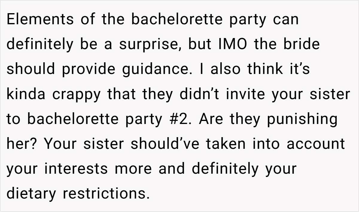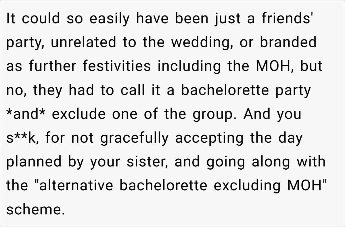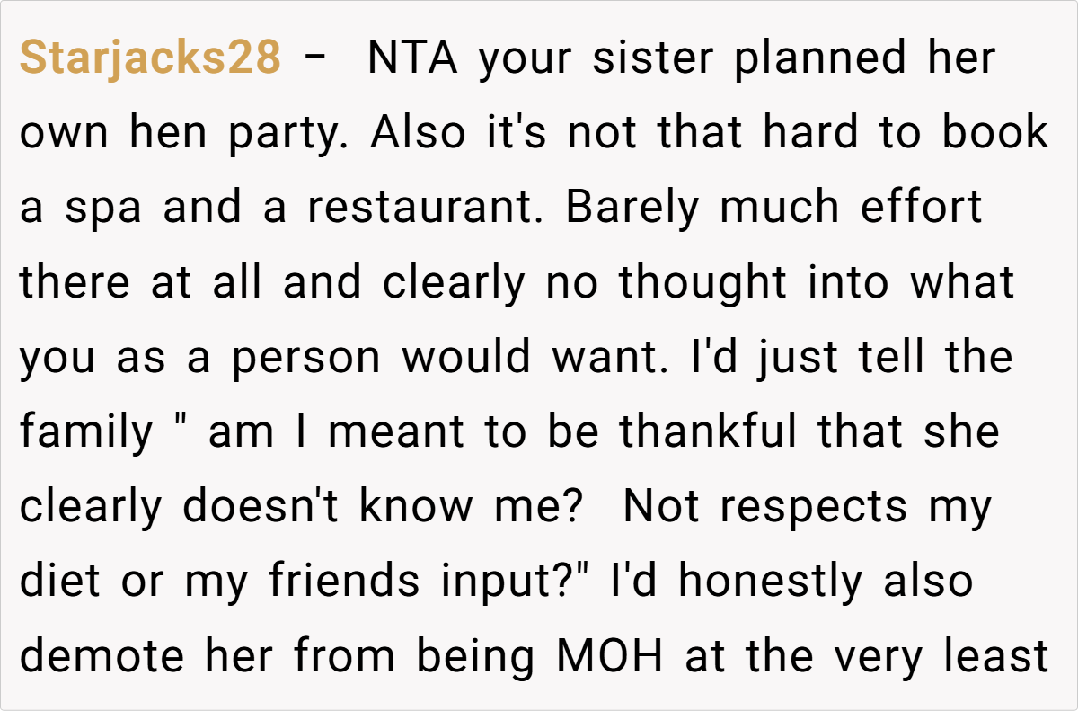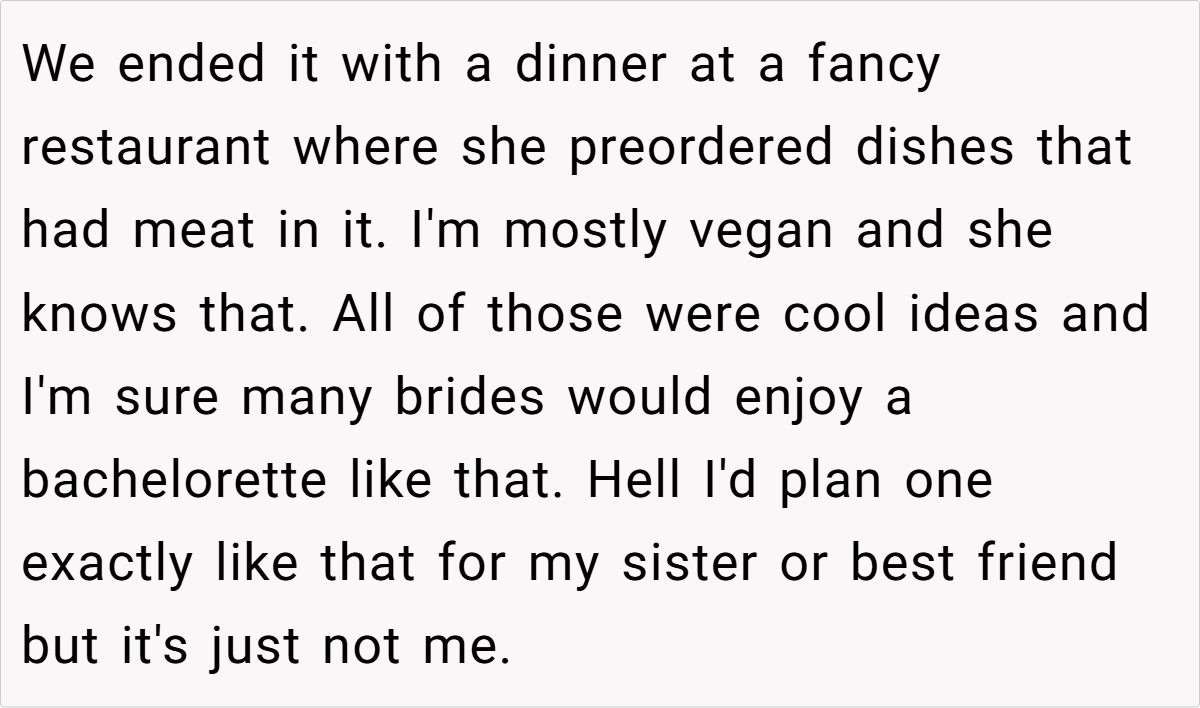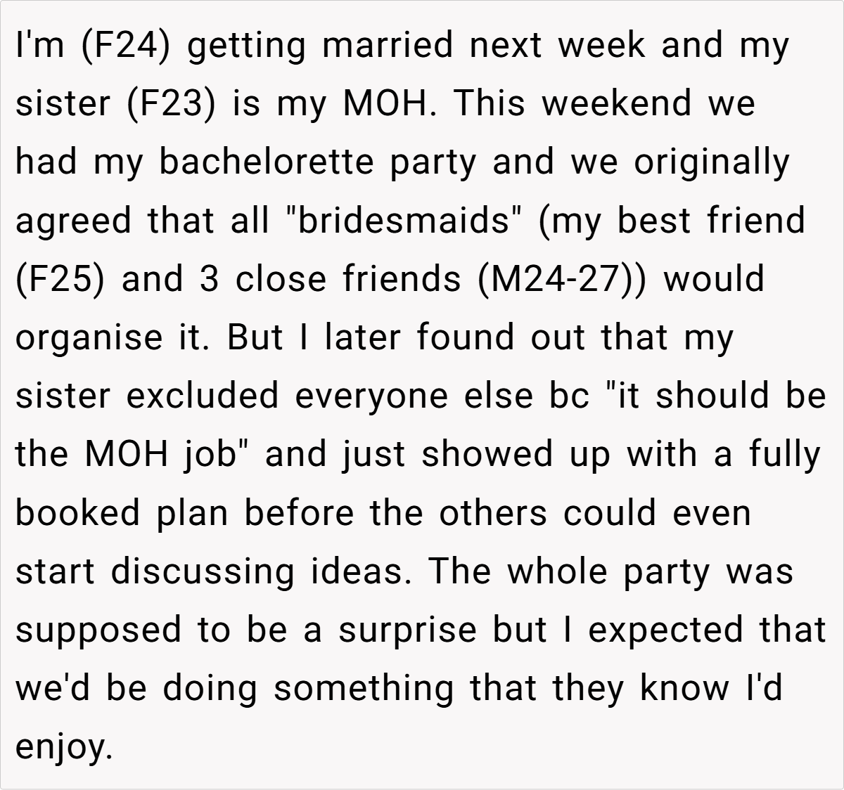 A Reddit user (24F) shares that her MOH, her sister (23F), took over the planning of her bachelorette party, excluding other friends from contributing. Unfortunately, the event was filled with activities the bride doesn’t enjoy—spa treatments, fancy dresses, and a meat-heavy dinner, even though the bride is mostly vegan.