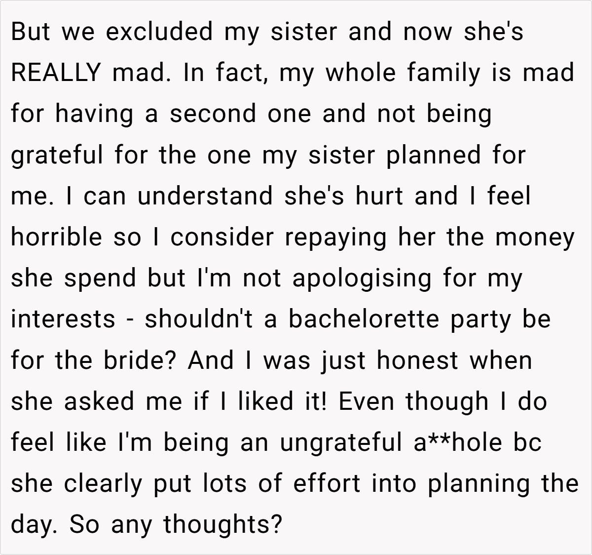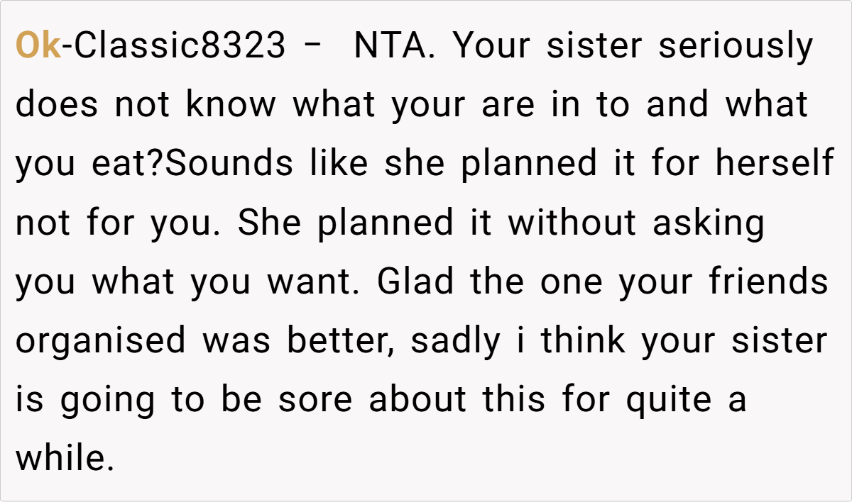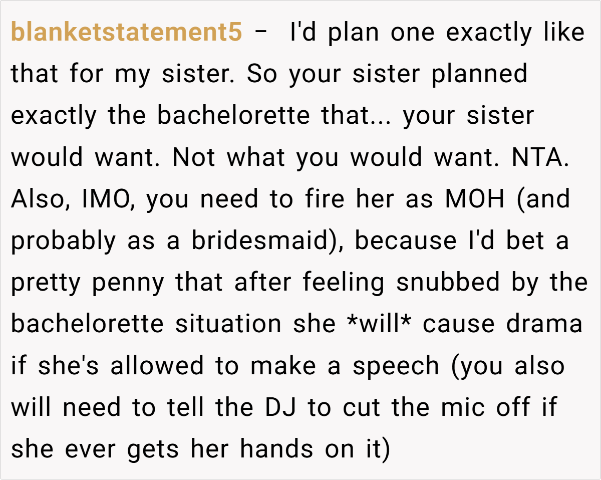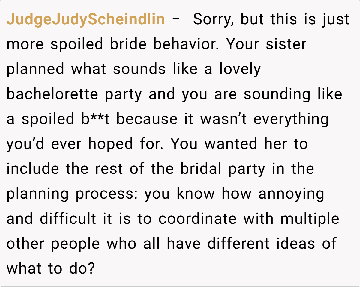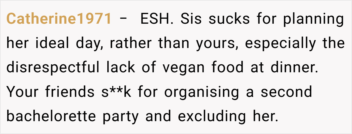 A Reddit user (24F) shares that her MOH, her sister (23F), took over the planning of her bachelorette party, excluding other friends from contributing. Unfortunately, the event was filled with activities the bride doesn’t enjoy—spa treatments, fancy dresses, and a meat-heavy dinner, even though the bride is mostly vegan.