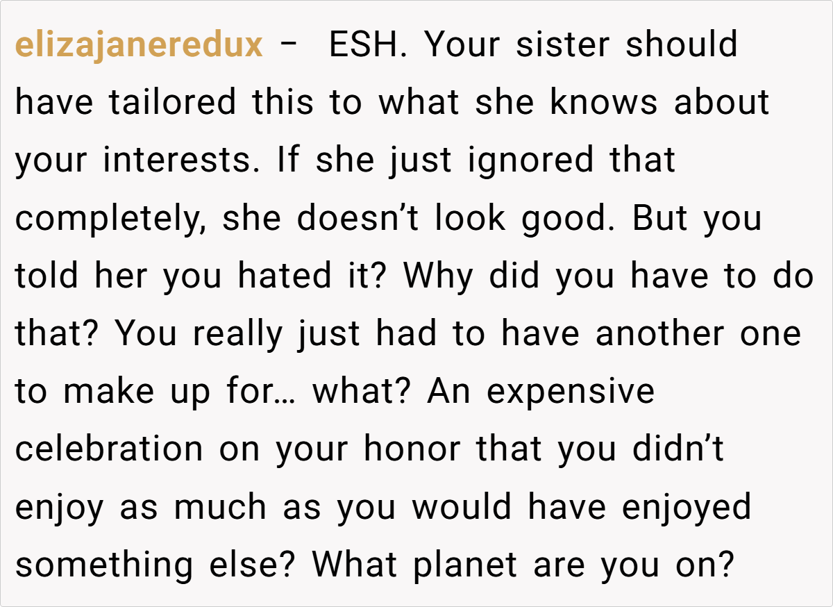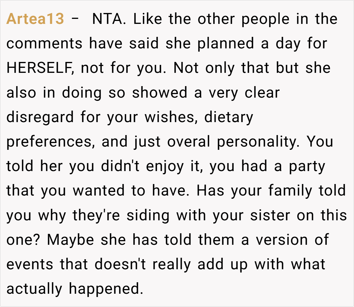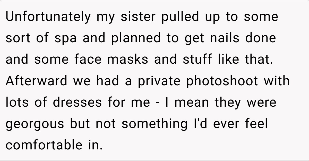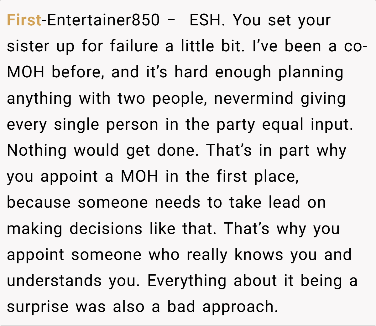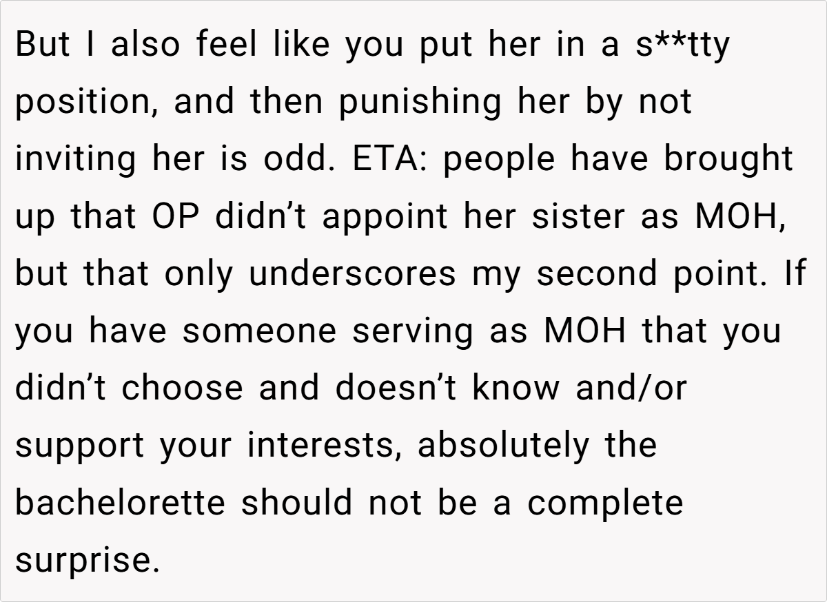 A Reddit user (24F) shares that her MOH, her sister (23F), took over the planning of her bachelorette party, excluding other friends from contributing. Unfortunately, the event was filled with activities the bride doesn’t enjoy—spa treatments, fancy dresses, and a meat-heavy dinner, even though the bride is mostly vegan.