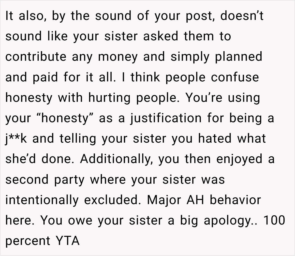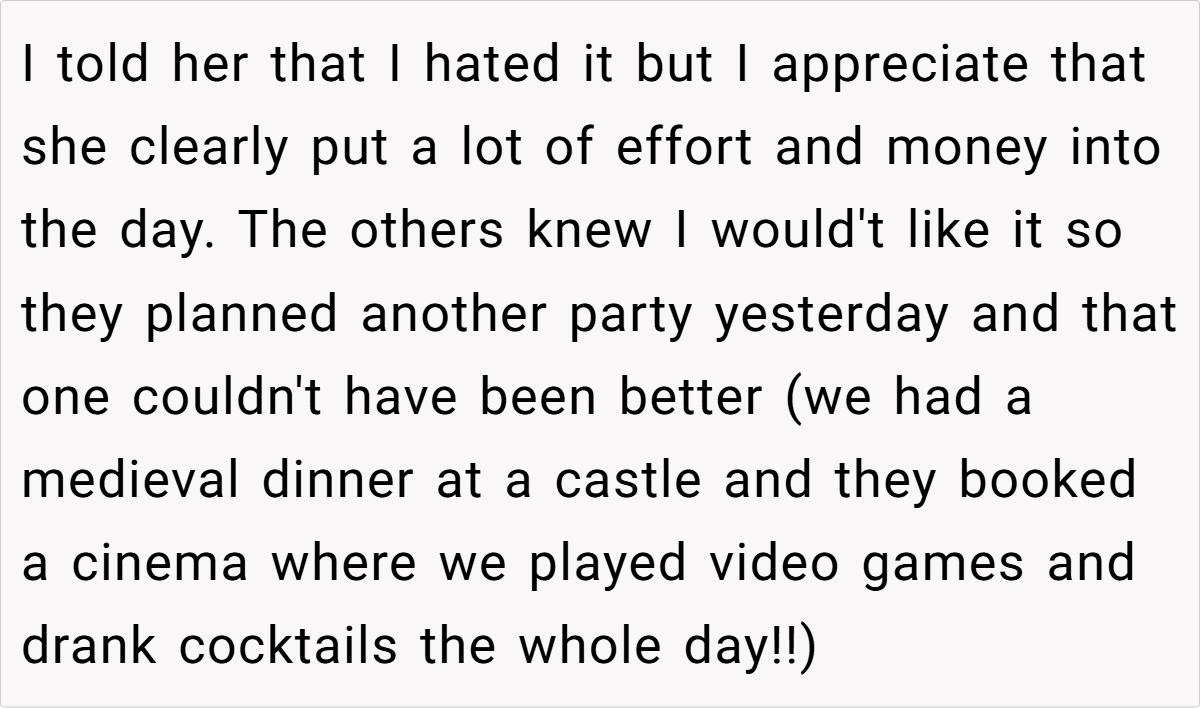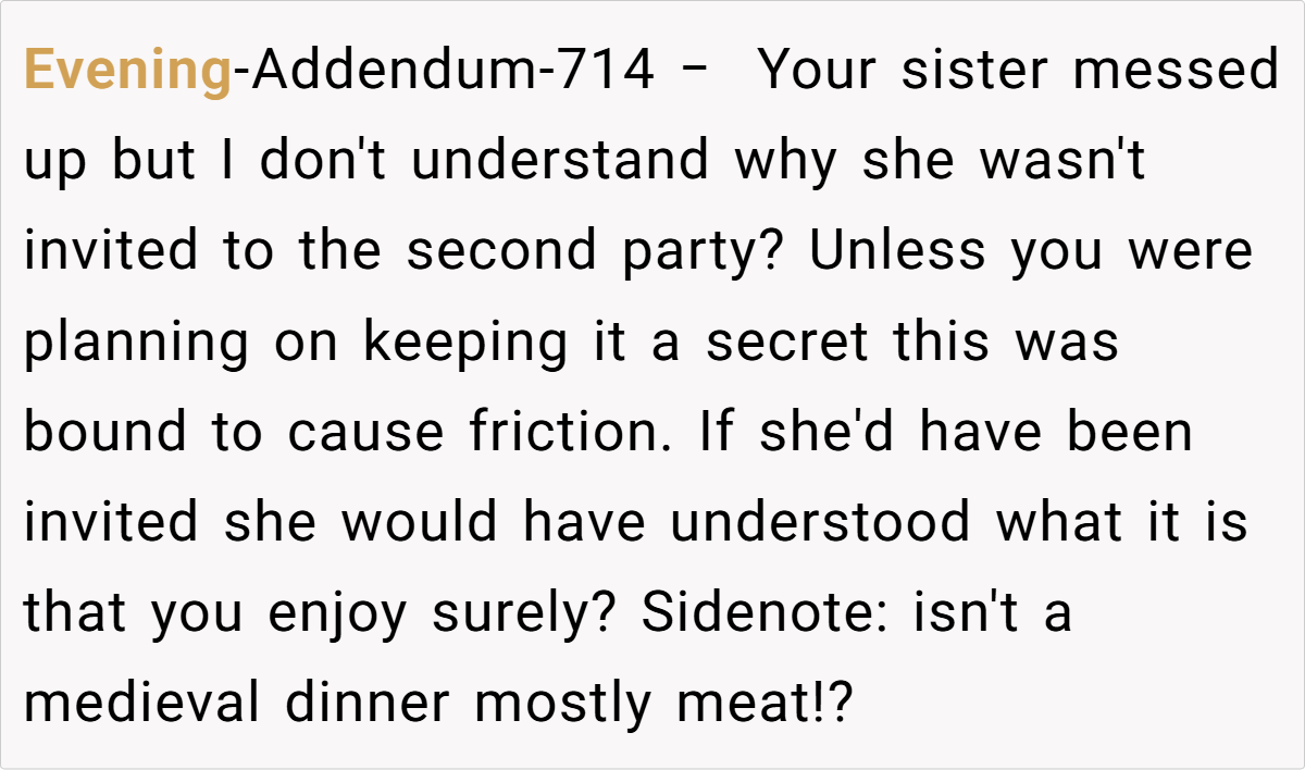While she acknowledged her sister’s effort, she admitted that the party wasn’t her style. In response, her friends secretly organized a second party tailored to the bride’s interests: a medieval dinner, gaming, and cocktails. However, they excluded the sister from the event, which caused a huge fallout with the family, accusing the bride of being ungrateful. Now, the bride wonders if she’s in the wrong for wanting a party she actually enjoyed.