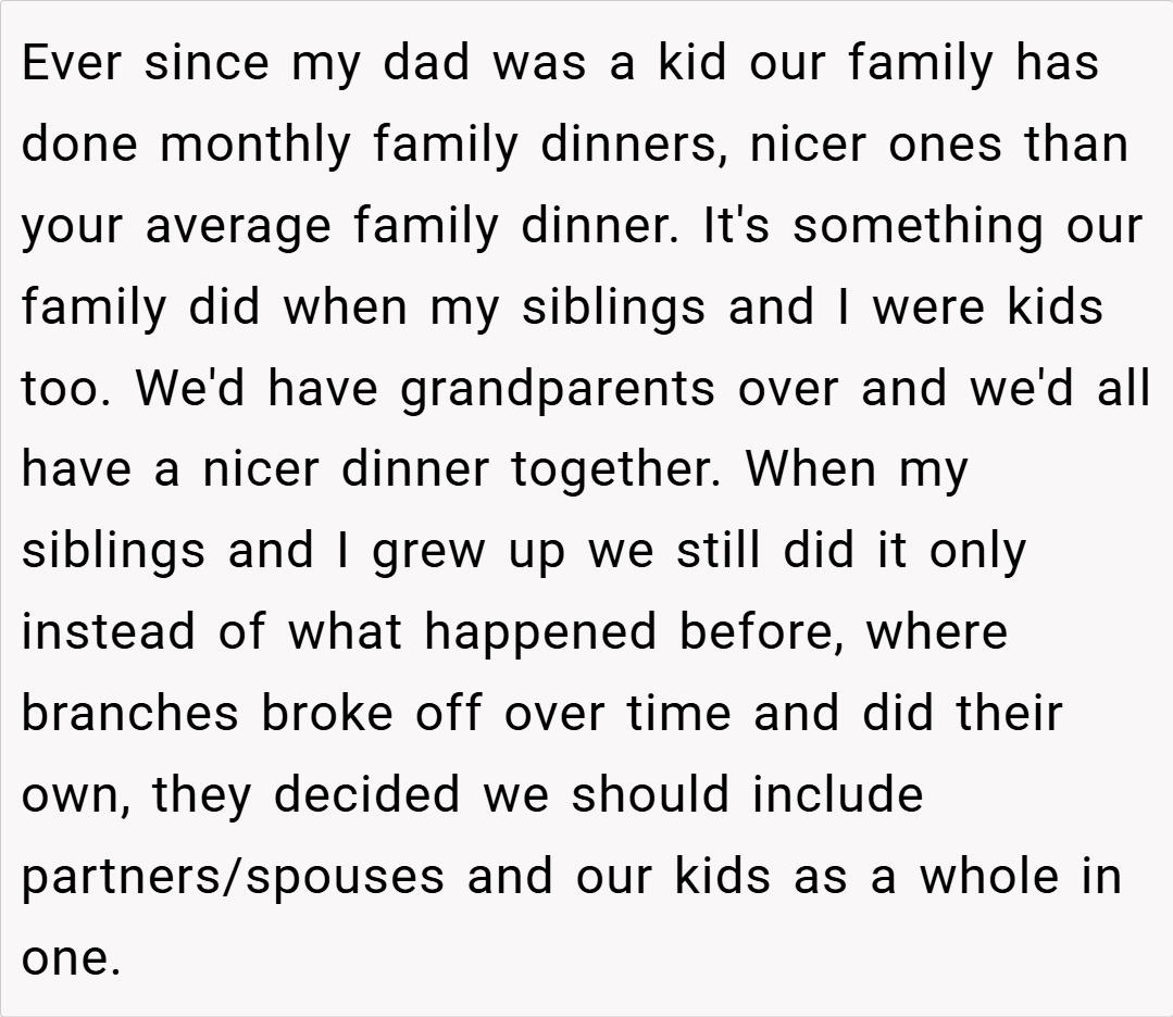 Family traditions can be a source of comfort, unity, and even pride—but when they start to feel like an obligation that undermines personal relationships, tensions can quickly rise. In this case, our OP, a 27‑year‑old woman, recounts her decision to put an end to the monthly family dinners that have been a long-standing tradition in her family. Although these dinners began during her childhood as a way to bring everyone together, they eventually evolved into a burdensome event,