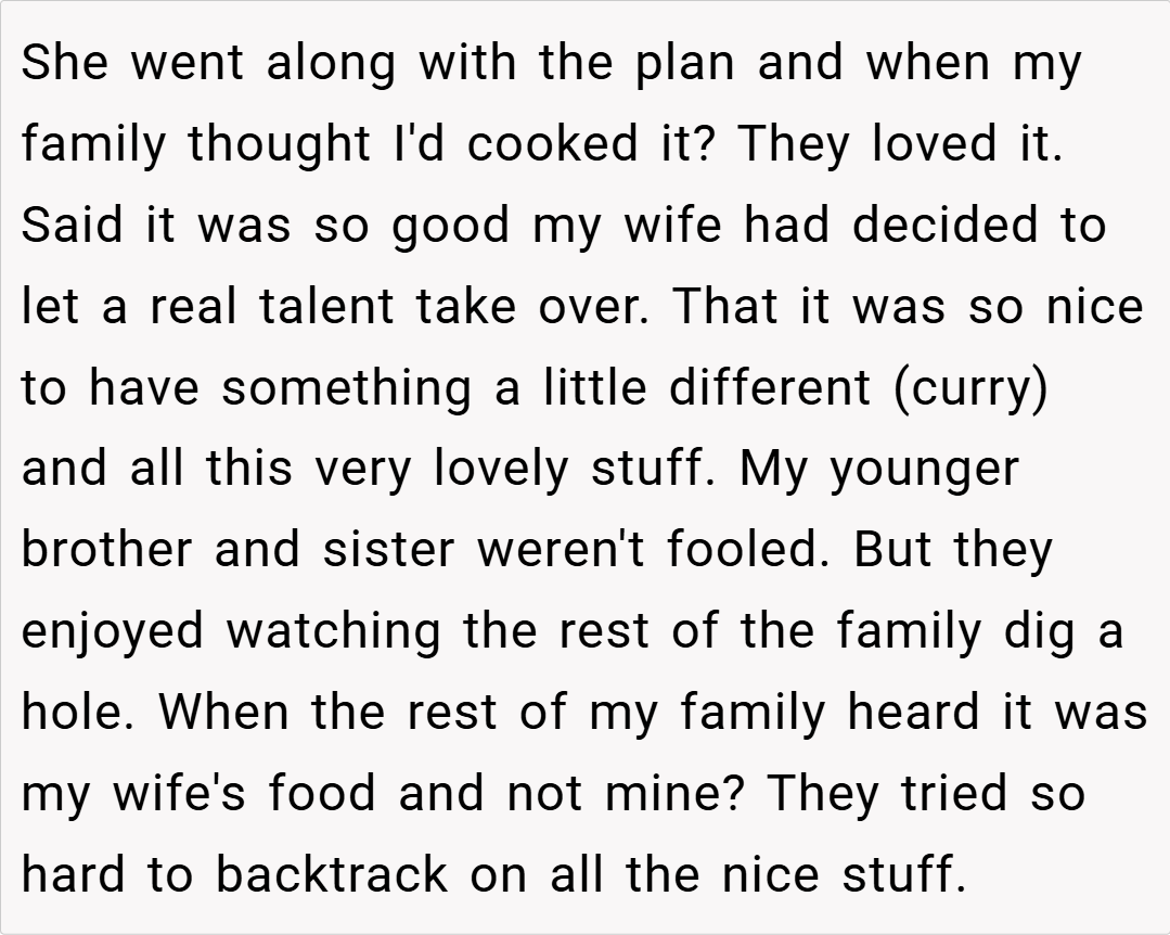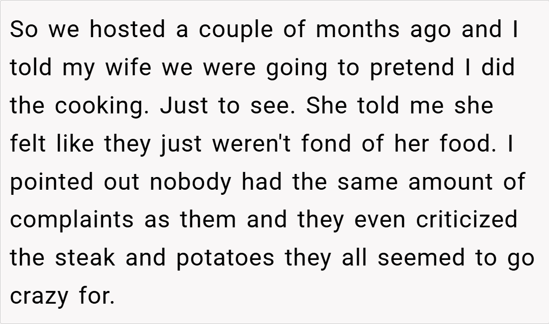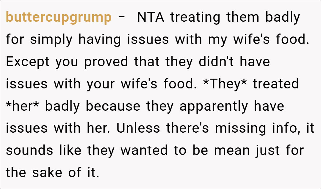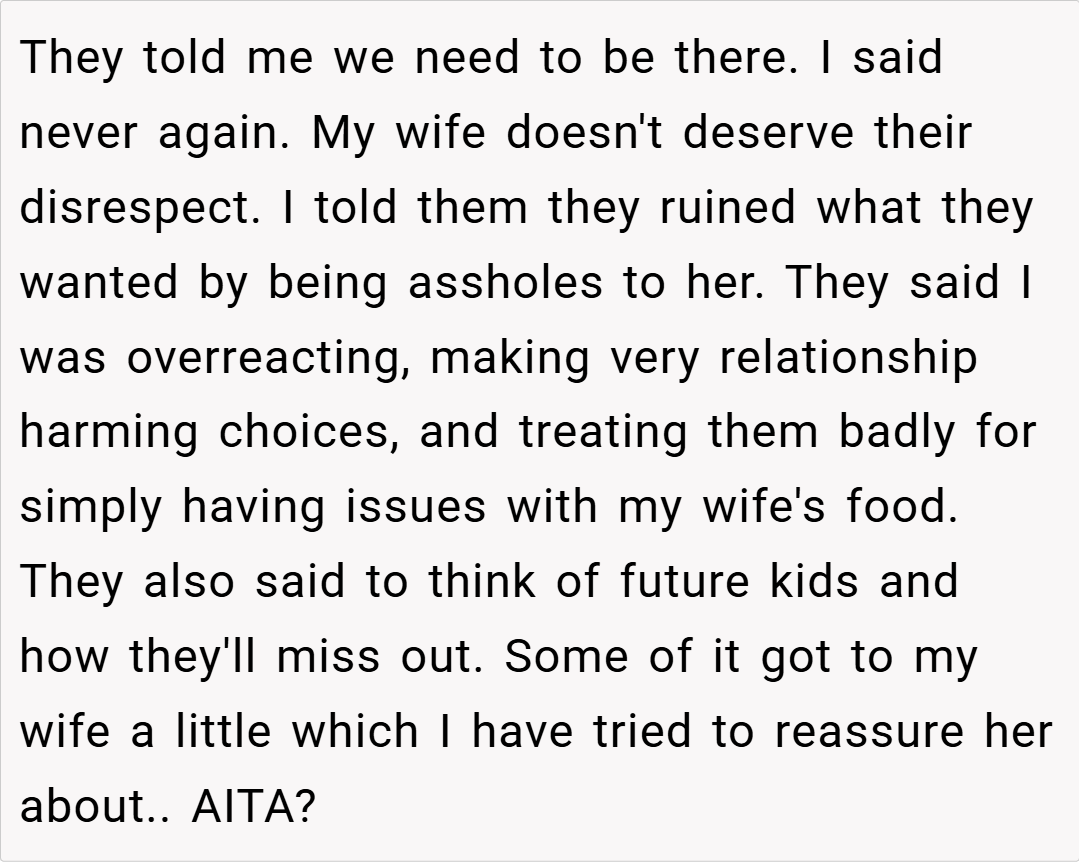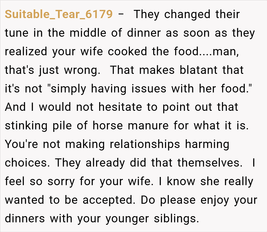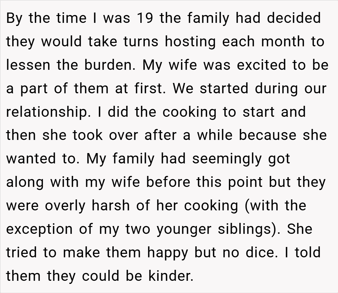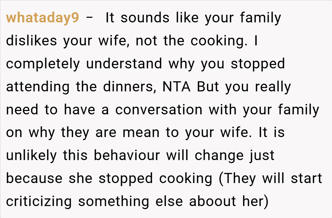 especially after her wife joined the family. Despite her wife’s best efforts, the extended family’s harsh criticism of her cooking and constant nitpicking made these dinners a source of stress rather than joy. Faced with ongoing disrespect toward her partner—and ultimately her wife—OP decided to cancel her participation in the dinners, insisting that her wife deserves to be prioritized. Now, her family is calling her selfish, and she’s left wondering if her decision was too drastic.