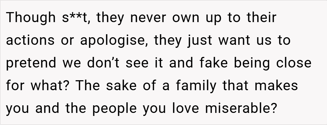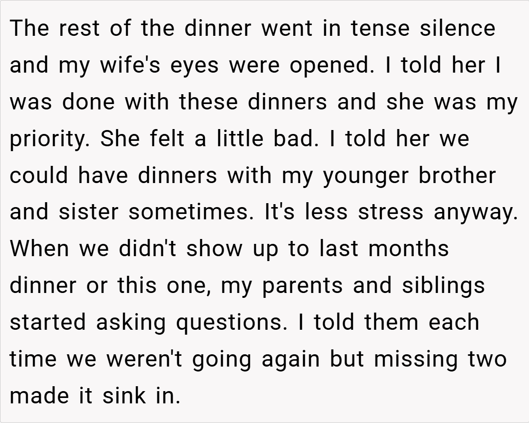 Family therapist Dr. Susan Johnson adds, “In any relationship, especially within extended families, communication and mutual respect are essential. If a tradition is causing emotional distress and conflict, it might be necessary to either renegotiate its terms or, as in this case, opt out entirely. OP’s decision to stop attending the monthly dinners is less about rejecting family and more about protecting her immediate family’s harmony.