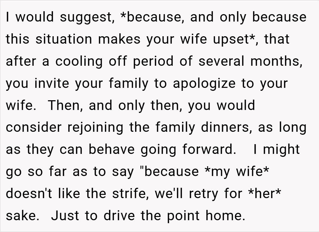 Many redditors support OP’s decision, stating that if a family tradition consistently brings pain rather than joy, it’s perfectly acceptable to walk away. “Your wife’s feelings matter, and if the dinners cause her distress, then you’re making the right call,” one commenter noted.
