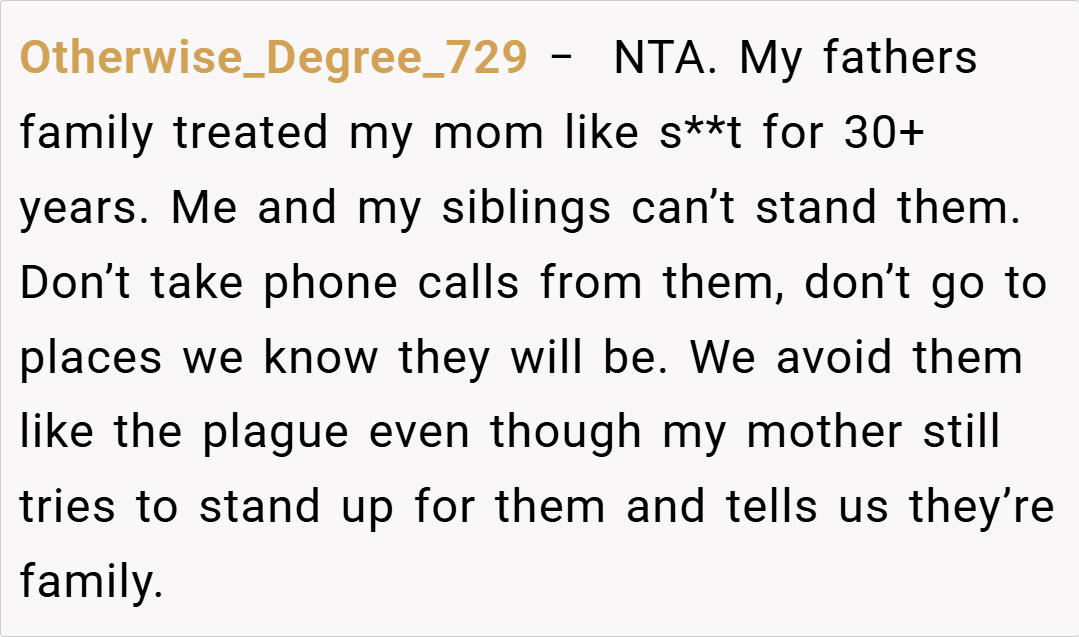 Ultimately, OP’s decision to cancel her participation in the monthly family dinners appears to be rooted in a desire to shield her wife—and by extension, her immediate family—from ongoing disrespect and criticism. While extended family traditions can be meaningful, they should never undermine the well-being of those closest to you.