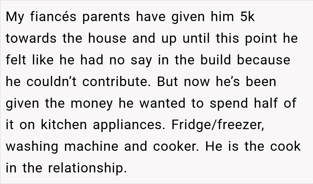 When building a home together, differences in priorities can spark unexpected tension—even in matters as seemingly straightforward as the kitchen. I (F32) and my fiancé are purchasing a new house with a little help from our parents. Due to our financial situation, my parents are fronting most of the costs for the house deposit, while we’ll be paying the mortgage.