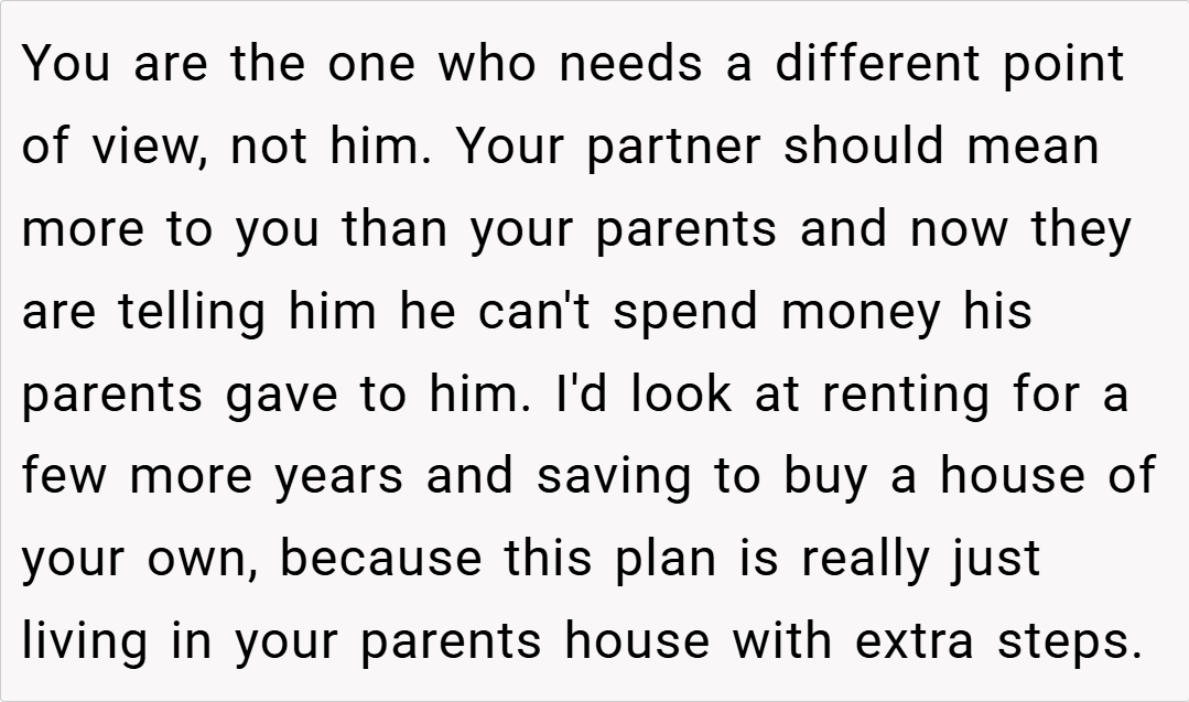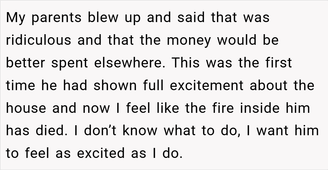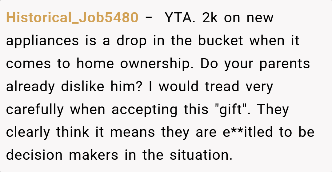 Now, as the designated cook in our relationship, he is passionate about creating a dream kitchen with a top-of-the-line fridge/freezer, washing machine, and cooker. However, my parents strongly object, arguing that the money would be better spent elsewhere. His enthusiasm seems to have dampened, and I’m left wondering if I’m wrong for standing firm and trying to steer him away from this expensive vision. Am I the asshole for telling him he can’t have the kitchen he wants?
