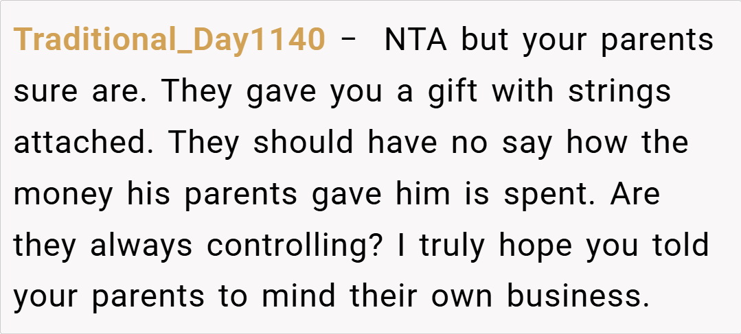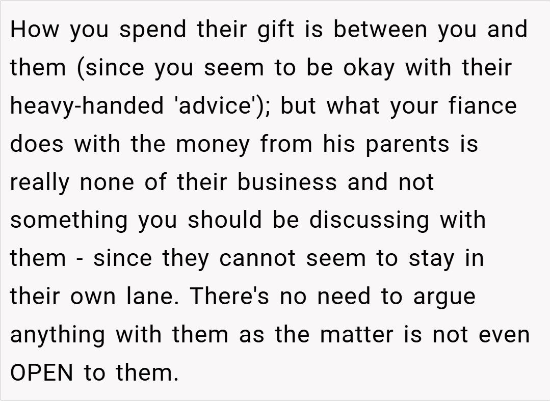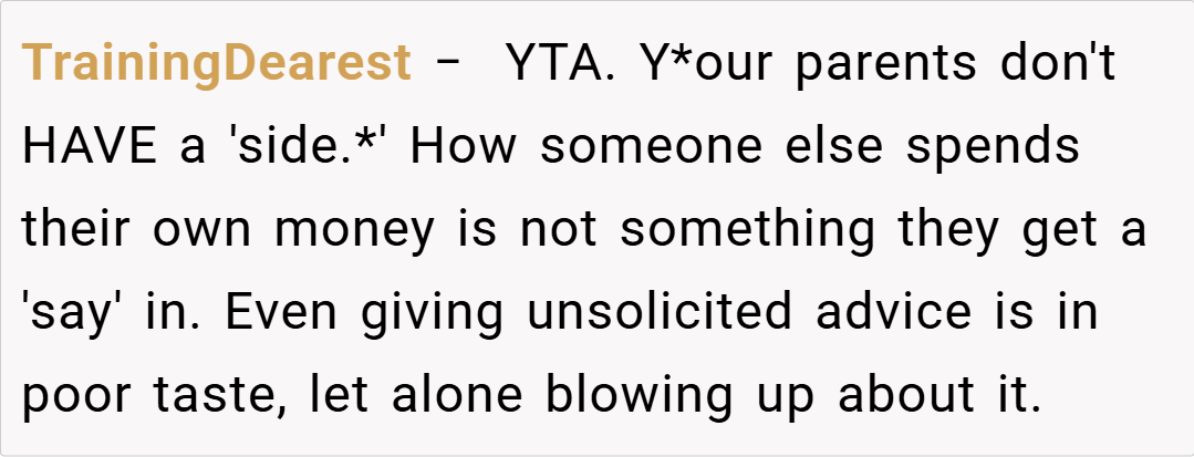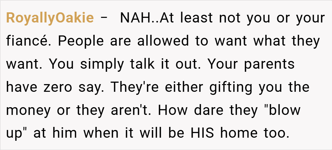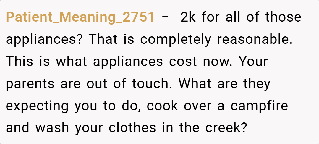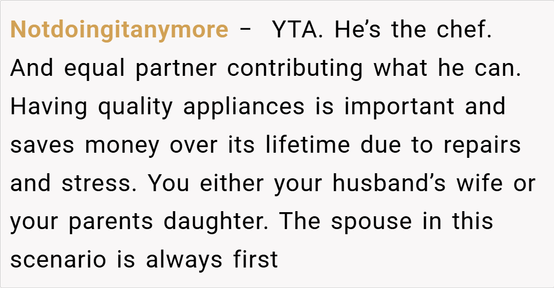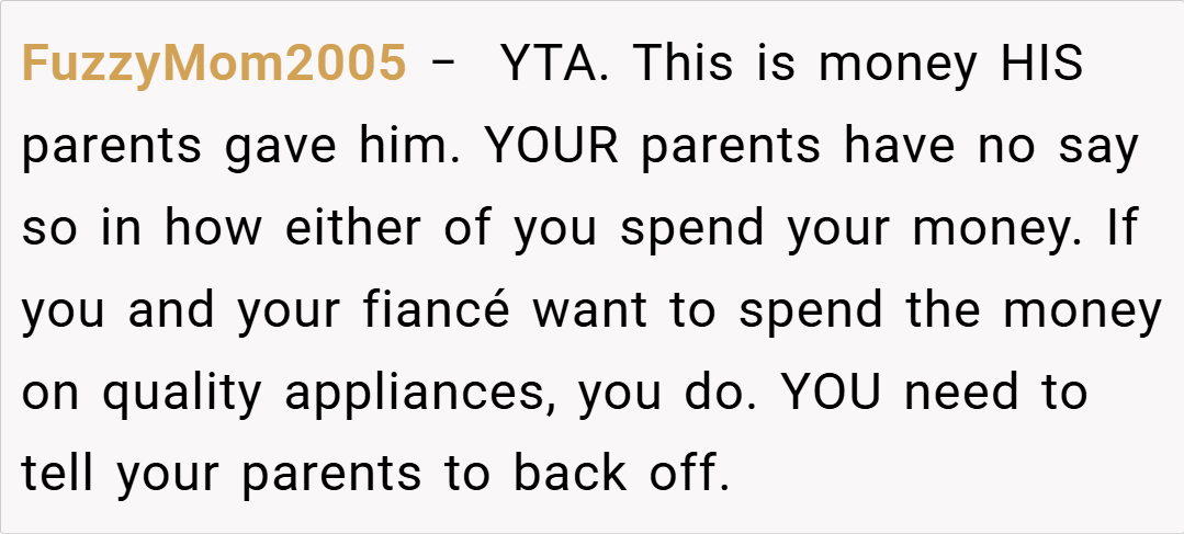Several redditors expressed support for your decision. One user commented, “If your parents are funding most of the deposit, it’s reasonable to prioritize financial stability over luxury appliances. Your fiancé needs to understand that your budget is tight and that every dollar counts for future expenses.”