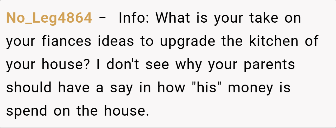 Another commenter shared, “It sounds like your fiancé’s dream kitchen is more of a passion project than a necessity. With your current financial situation, it’s important to focus on practical needs first. You’re not being unreasonable by urging him to temper his enthusiasm.”