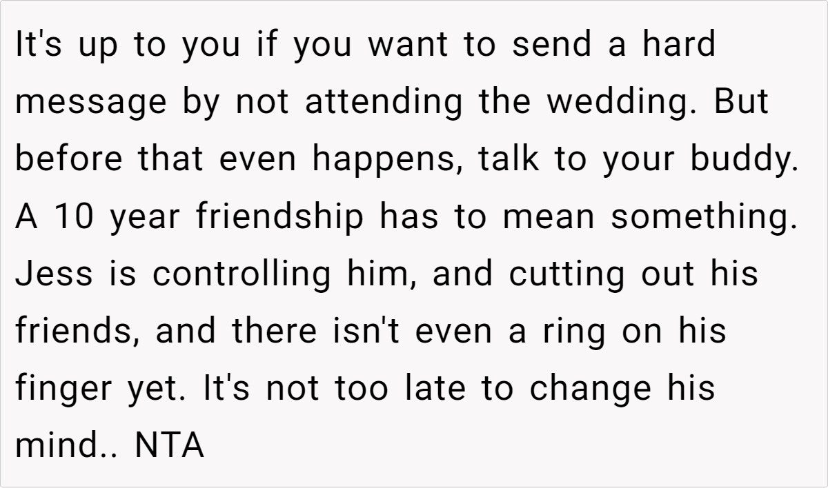 These are popular opinions on Reddit, but do they reflect reality? While some might argue that OP is overreacting or being petty by refusing to attend the wedding, it’s important to remember that friendships are built on mutual respect and trust. The fiancée’s controlling behavior and her attempts to exclude OP from the celebrations are disrespectful and hurtful, and OP’s decision to stand up for himself is understandable.
