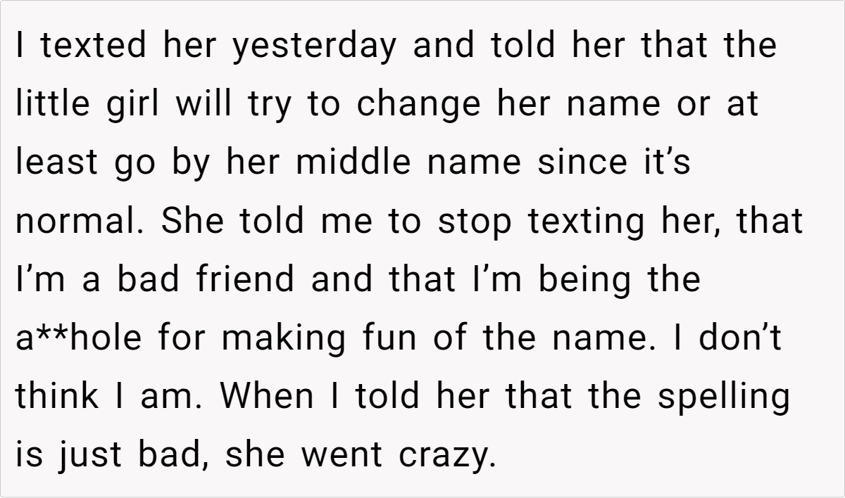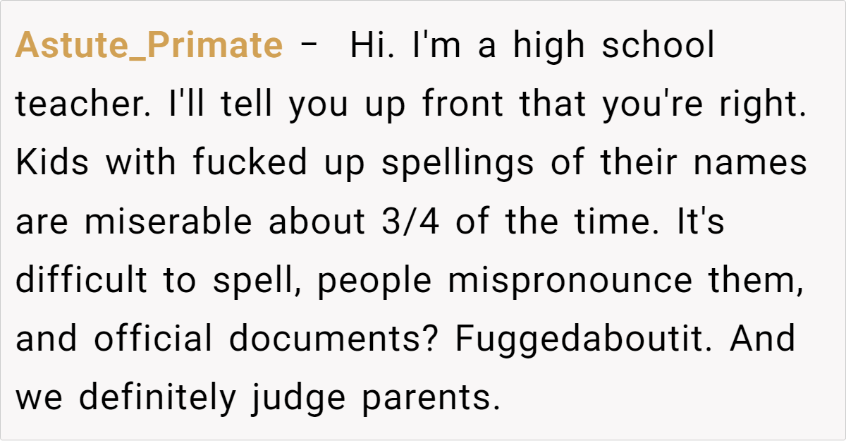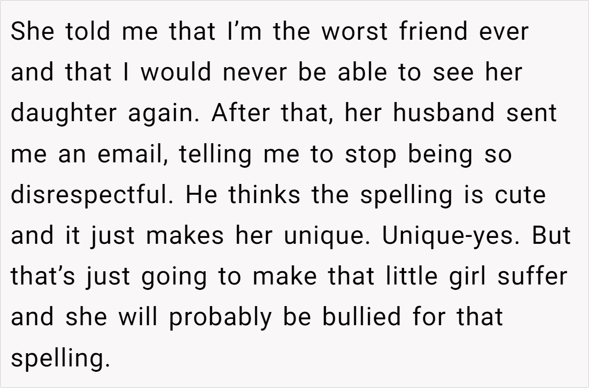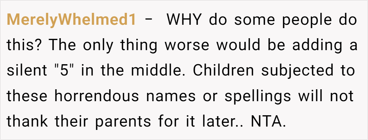 Names often become a battleground for cultural values and personal choices, and this story is no exception. It’s not uncommon for well-intentioned advice to ignite passionate debates about identity, self-expression, and the possible pitfalls of deviating from conventional norms. In this case, one friend is deeply concerned that an unusual spelling could lead to mispronunciations, teasing, and even future professional challenges.