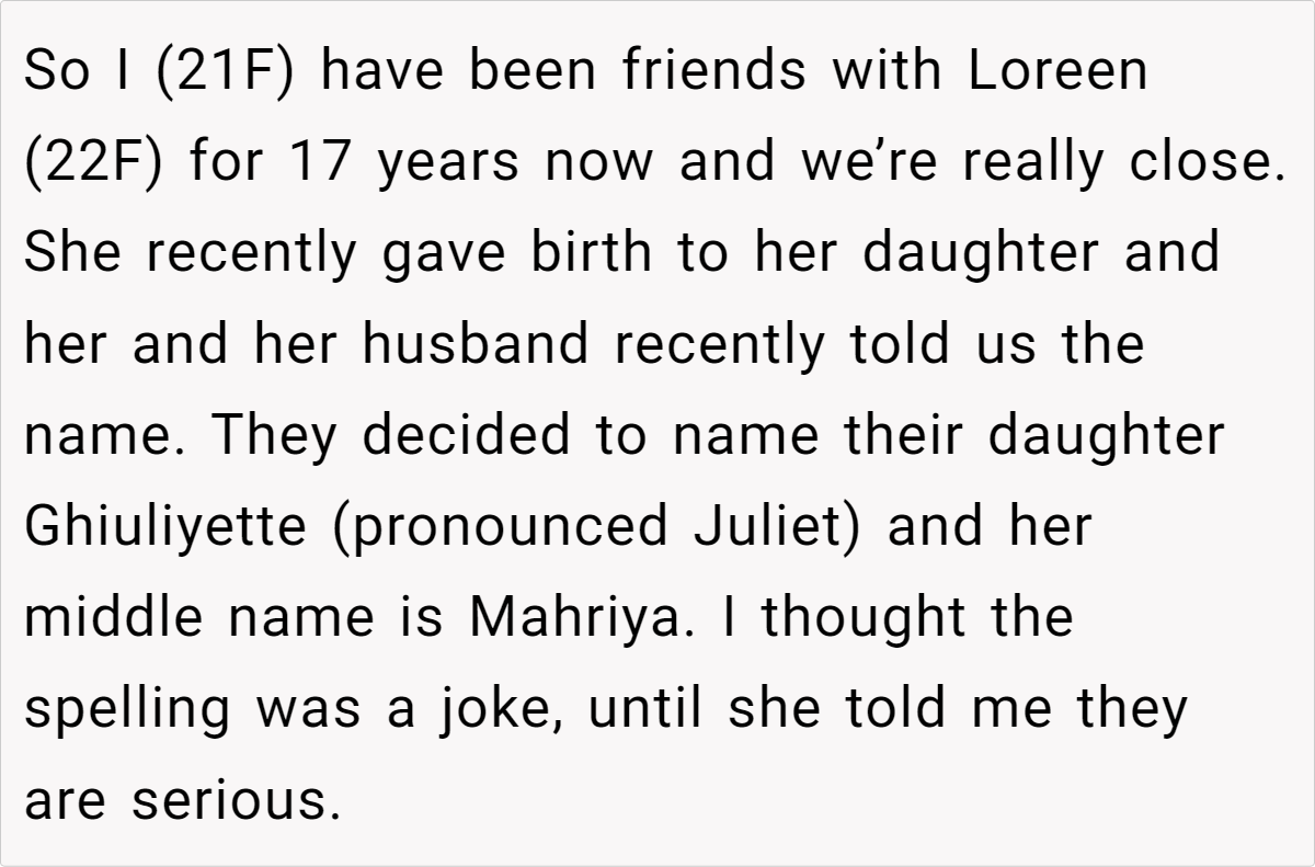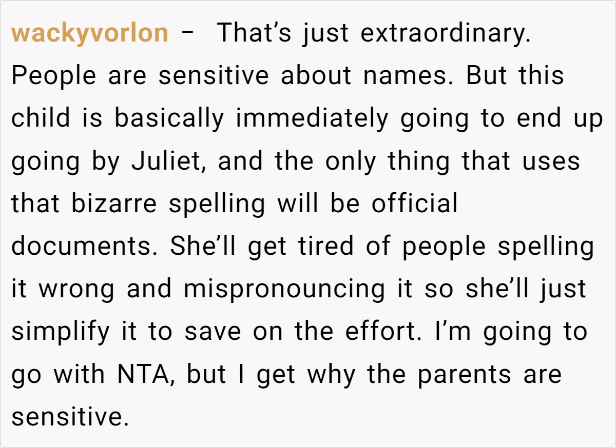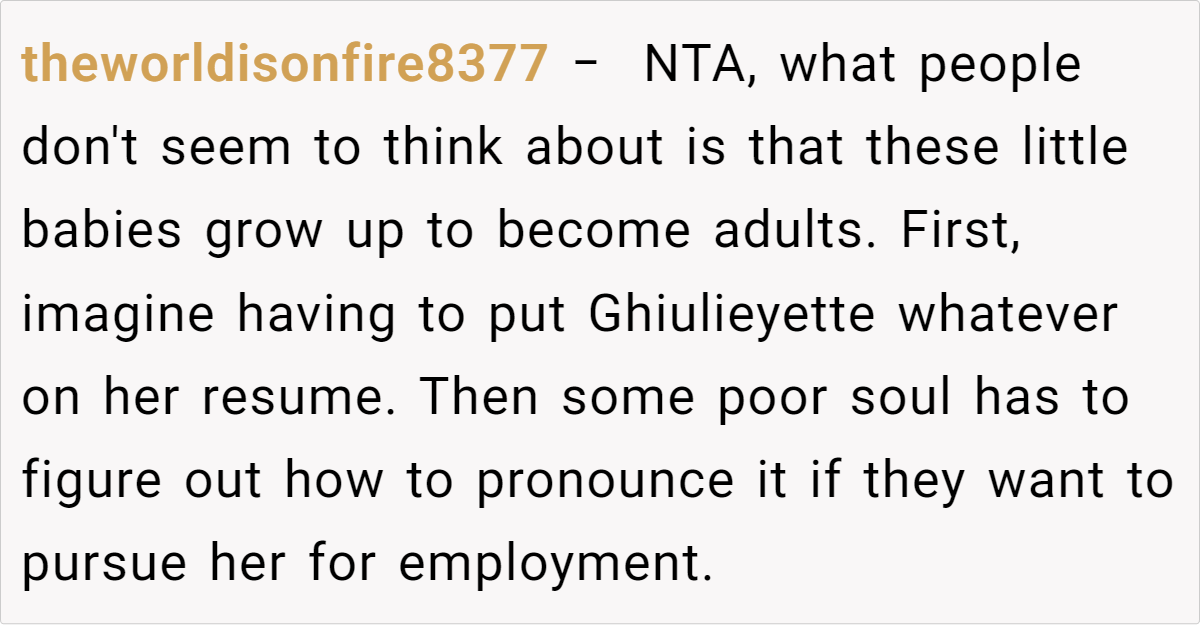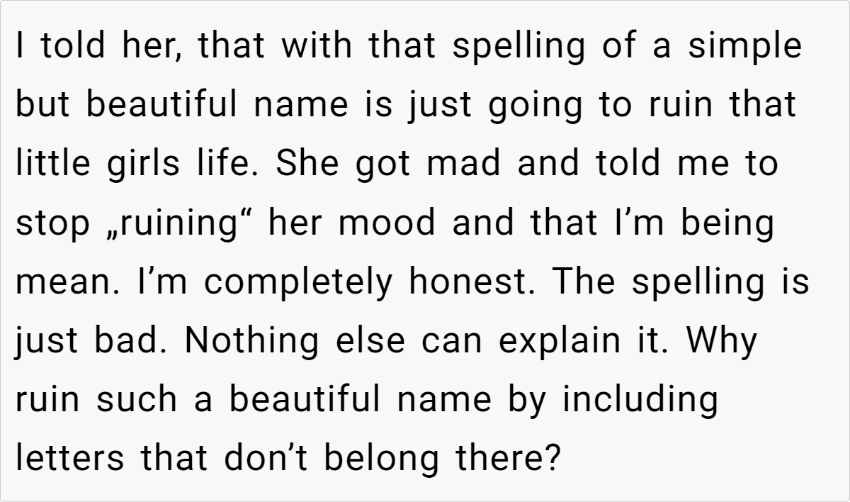 Names often become a battleground for cultural values and personal choices, and this story is no exception. It’s not uncommon for well-intentioned advice to ignite passionate debates about identity, self-expression, and the possible pitfalls of deviating from conventional norms. In this case, one friend is deeply concerned that an unusual spelling could lead to mispronunciations, teasing, and even future professional challenges.