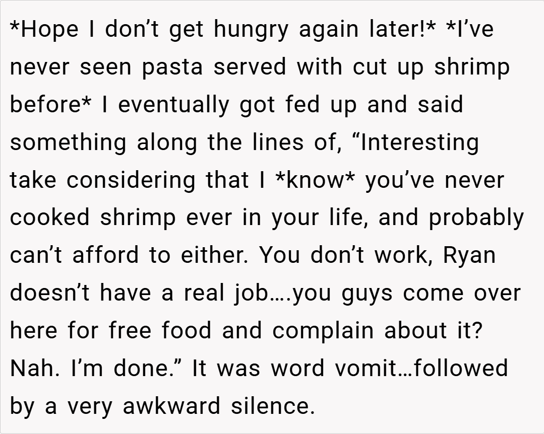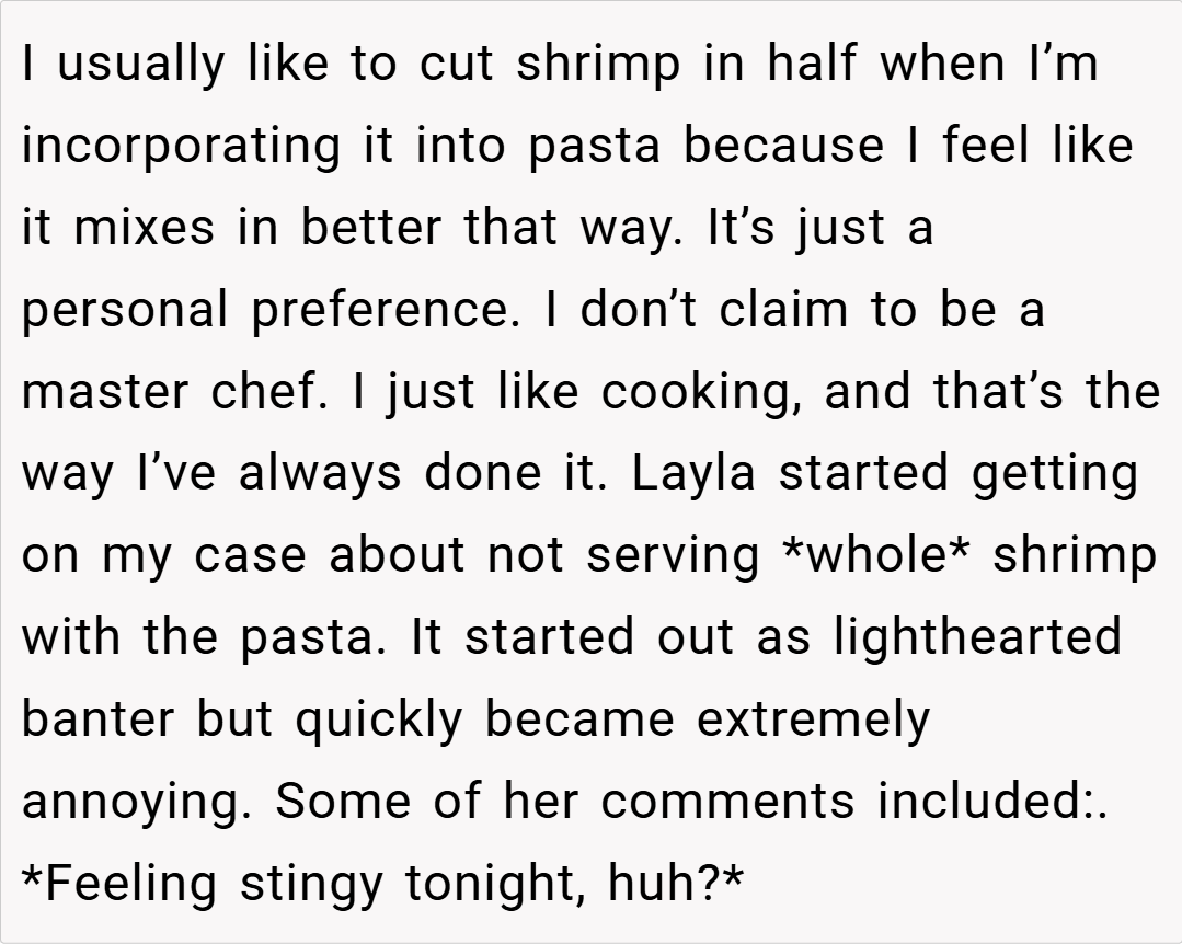 When dinner becomes a battleground for pride and personal values, even the most cherished traditions can turn sour. Last night, while preparing a special seafood pasta dinner for friends, our storyteller—someone who truly loves to cook—found himself in an unexpected confrontation. His best friend, Layla, started nitpicking his method of cutting shrimp in a lighthearted way that quickly escalated into something far more personal.
