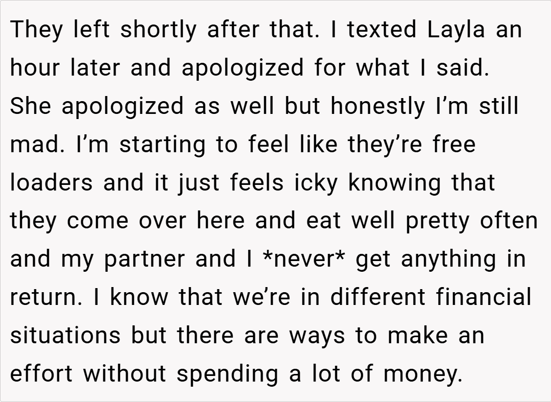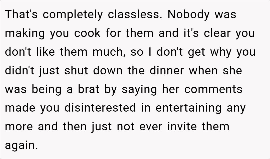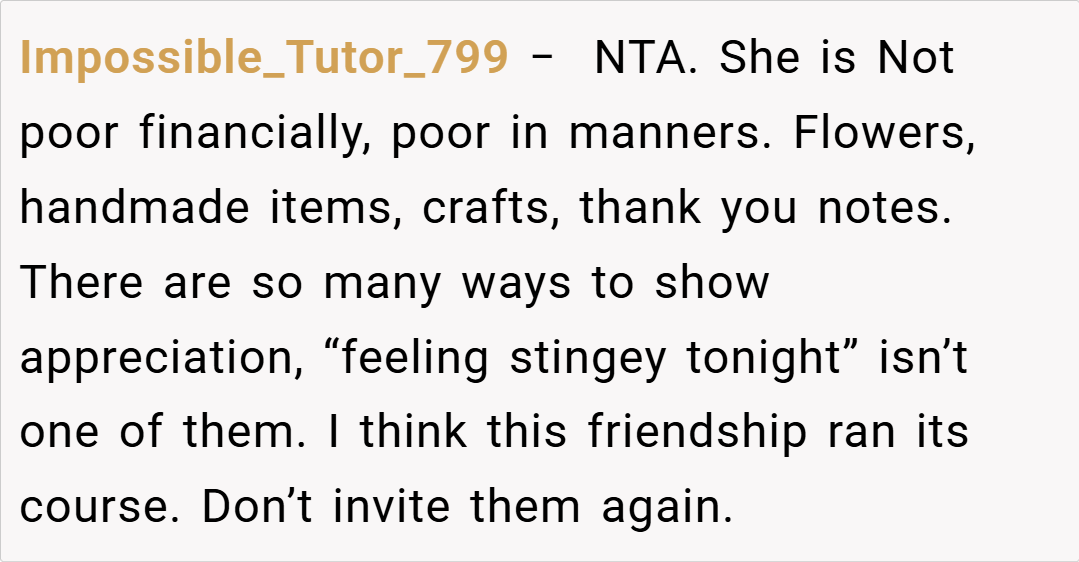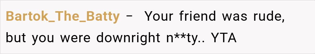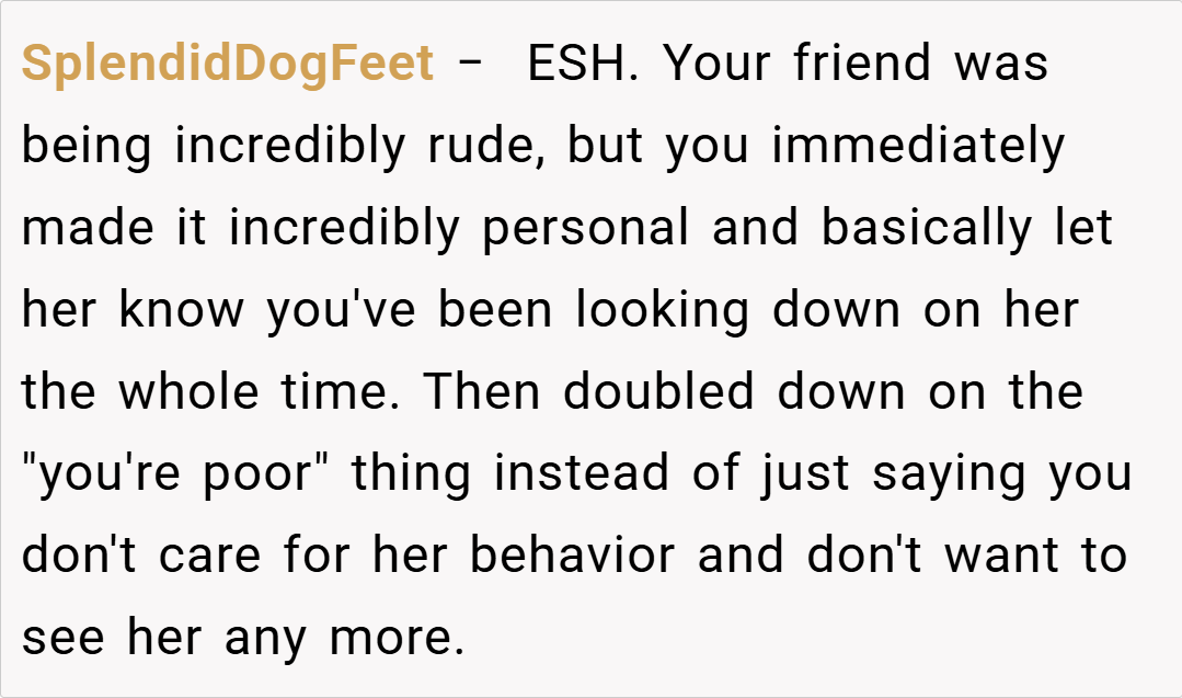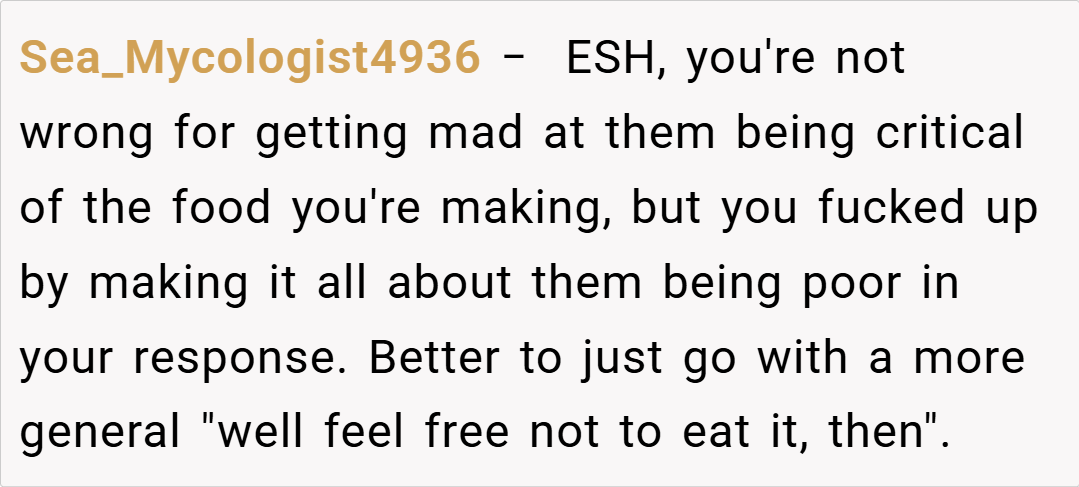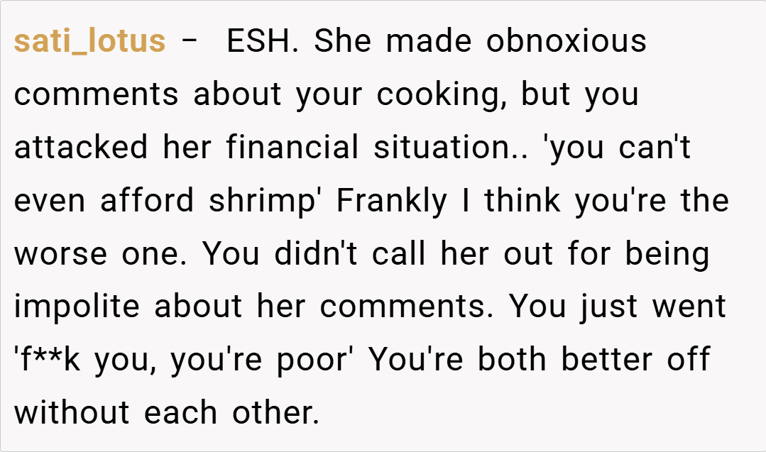 “Your friend’s comments were out of line, but attacking her financial status is a step too far. Criticizing cooking techniques is one thing, but using poverty as a weapon is both unnecessary and hurtful. I believe you should have expressed your feelings without resorting to personal insults.”