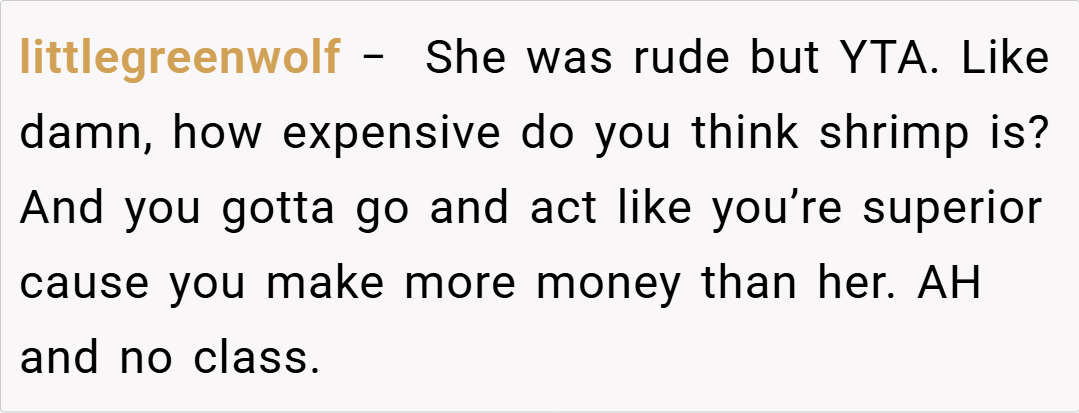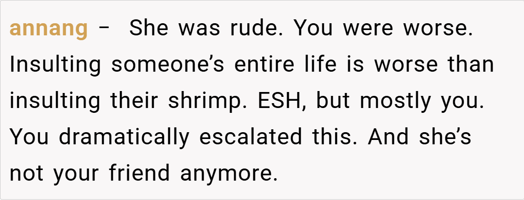 Ultimately, the core issue isn’t about how the shrimp was cut, but rather how financial insecurities can seep into personal interactions. Maintaining respect requires focusing on one’s own preferences without demeaning another’s circumstances. This situation underscores the need for empathy and constructive dialogue, reminding us that true friendship should accommodate differences without resorting to personal attacks.