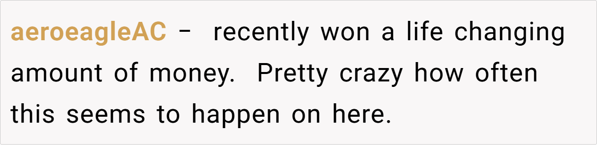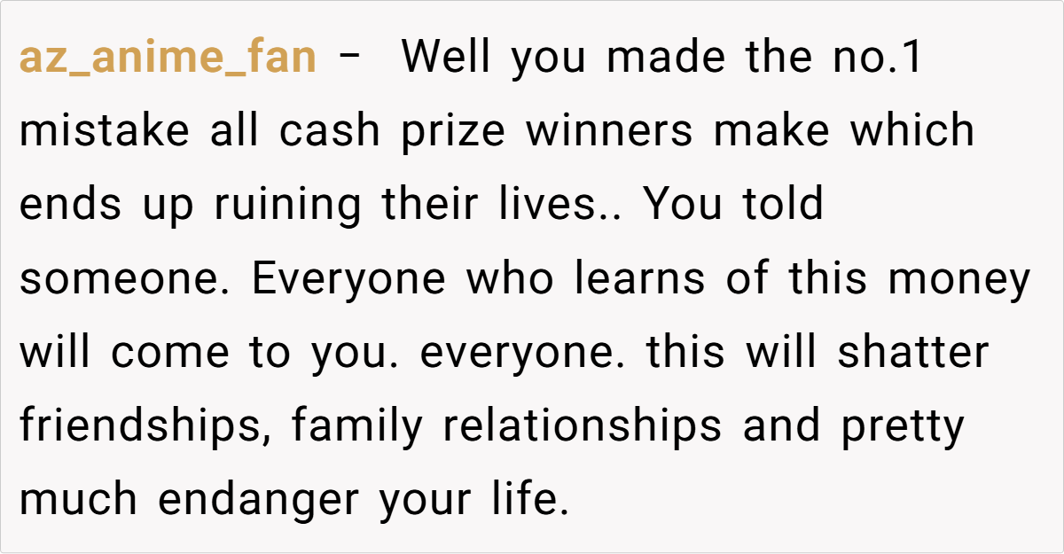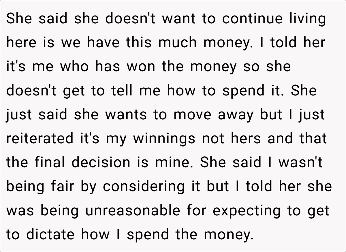 Redditors overwhelmingly support the OP’s decision to assert control over her winnings. Many commenters argue that a personal windfall, especially one acquired independently, is an individual asset and should be spent according to one’s own priorities. They emphasize that her choice to stay close to family and improve her current lifestyle is both reasonable and responsible.
