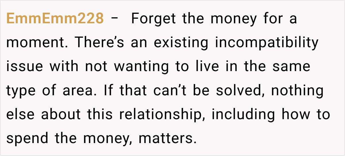 However, she also acknowledges that her girlfriend’s desire to relocate is not entirely unreasonable; it simply reflects a different set of priorities. “The key here is communication,” Dr. Orbuch adds. “When a financial windfall is involved, couples need to negotiate and align their visions to avoid resentment. In this situation, the OP’s clear boundary—that the money is hers to spend as she wishes—is legally and emotionally valid if it was won individually.”