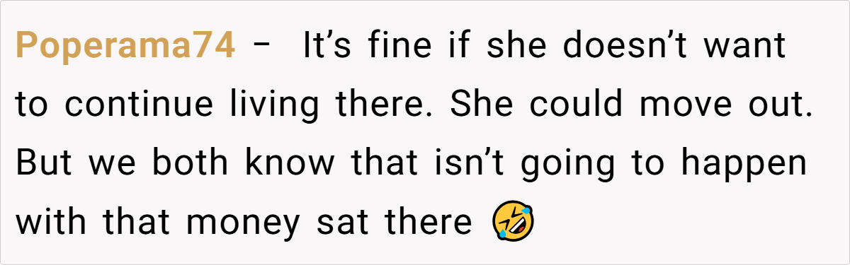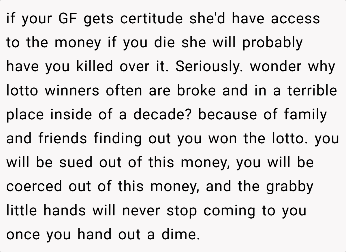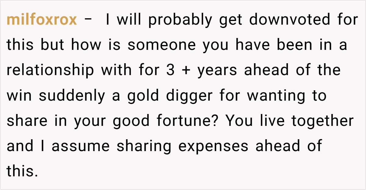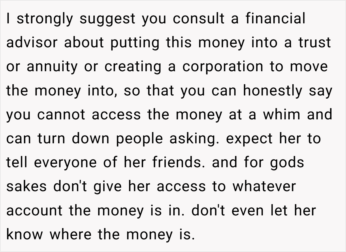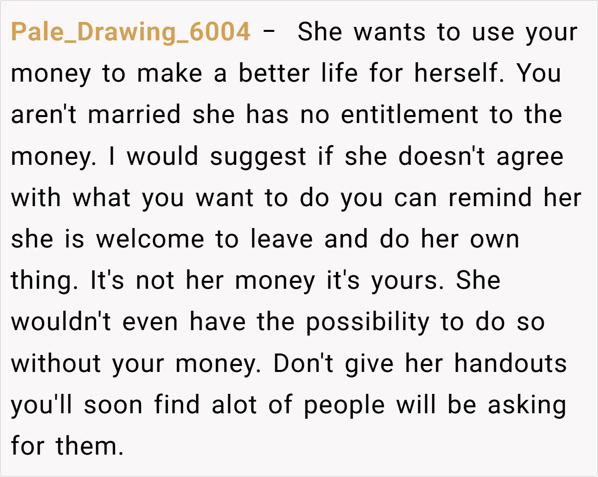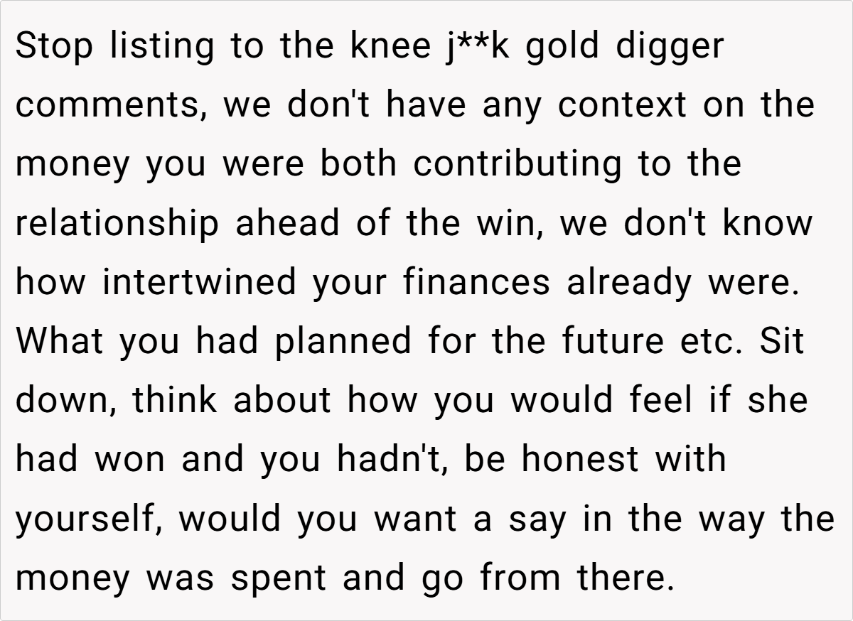 In contrast, her girlfriend’s desire to move away is seen by many as an imposition rather than a collaborative decision. Although a few voices suggest that financial decisions in a relationship should be made jointly, the dominant sentiment is that the OP is entirely within her rights, and her girlfriend’s expectation for shared control over the windfall is viewed as overreaching.