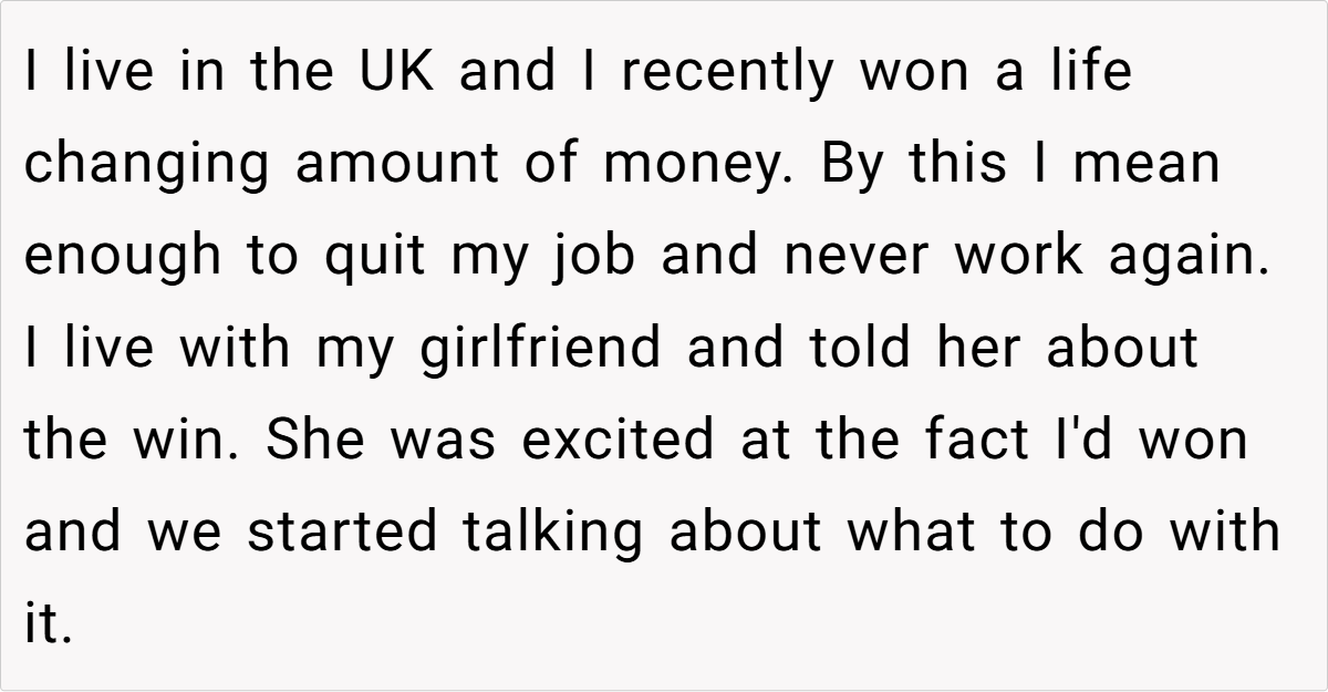 Winning a life-changing sum of money can turn life upside down, especially when it disrupts the dynamics of a long-term relationship. In this case, a UK resident shares her recent lottery win—a fortune large enough for her to quit her job and never work again—and the ensuing conflict with her girlfriend. Living in a deprived area, her girlfriend immediately dreams of moving to a better city, envisioning a life filled with luxury and opportunity.