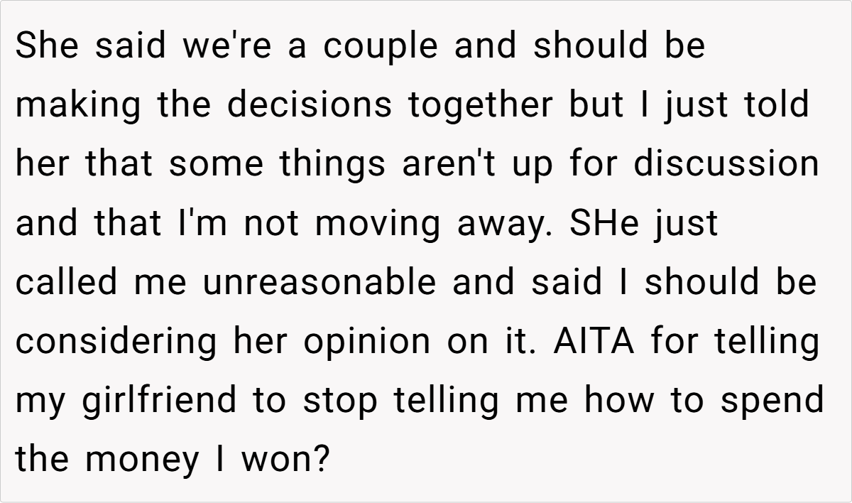 ‘ AITA for telling my girlfriend to stop telling me how to spend the money I won?’
