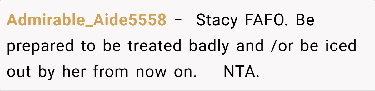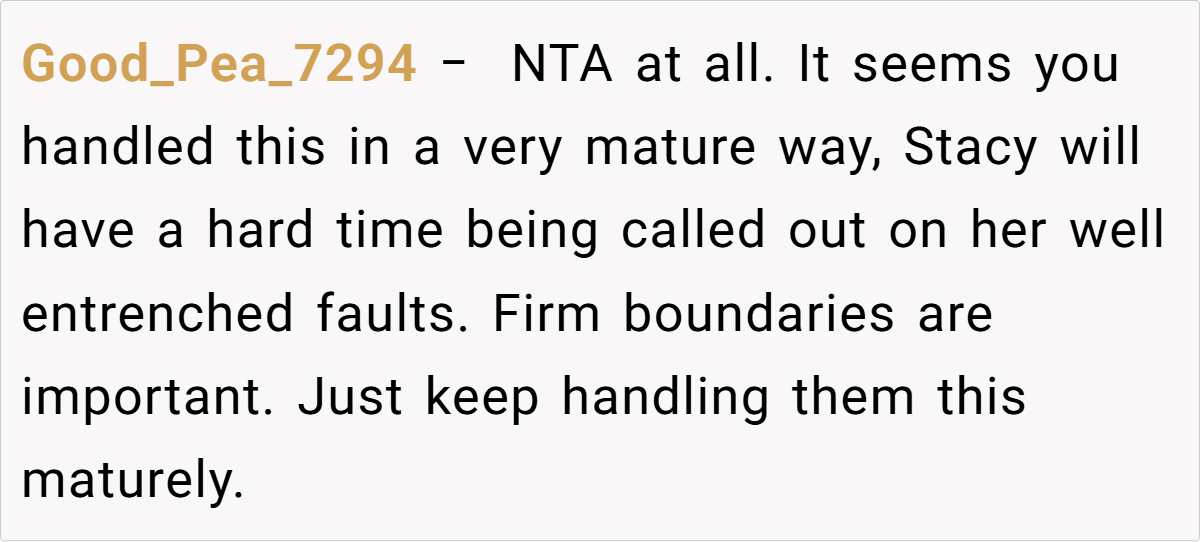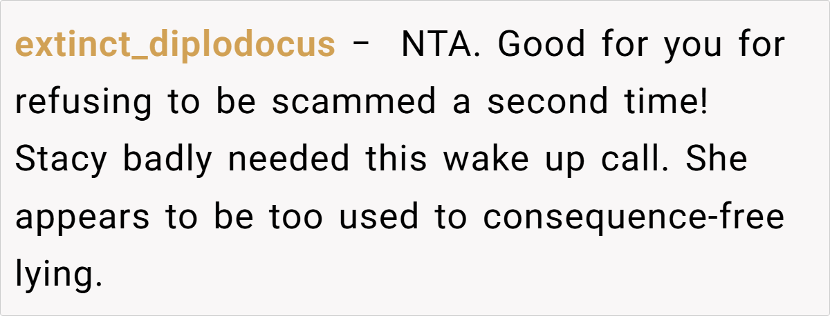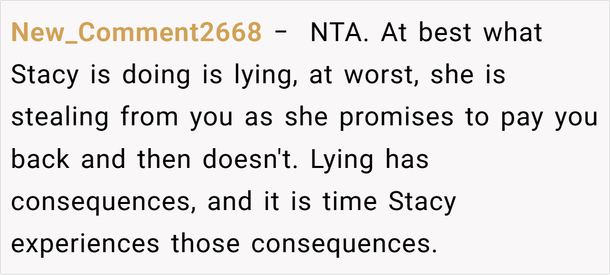 The Reddit community has largely sided with the OP in this situation. Many commenters emphasized that Stacy’s habitual lying is unacceptable and that the OP was well within his rights to call her out. Numerous voices supported his firm stance, arguing that repeated dishonesty, regardless of age, undermines trust and should indeed have consequences. The consensus among many was that, while the delivery might have been blunt, it was necessary to prompt a re-evaluation of the behavior that had long been taken for granted.
