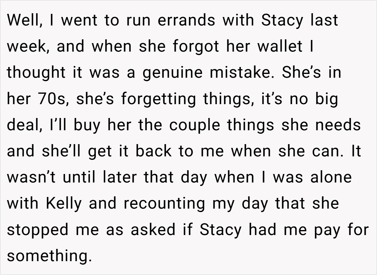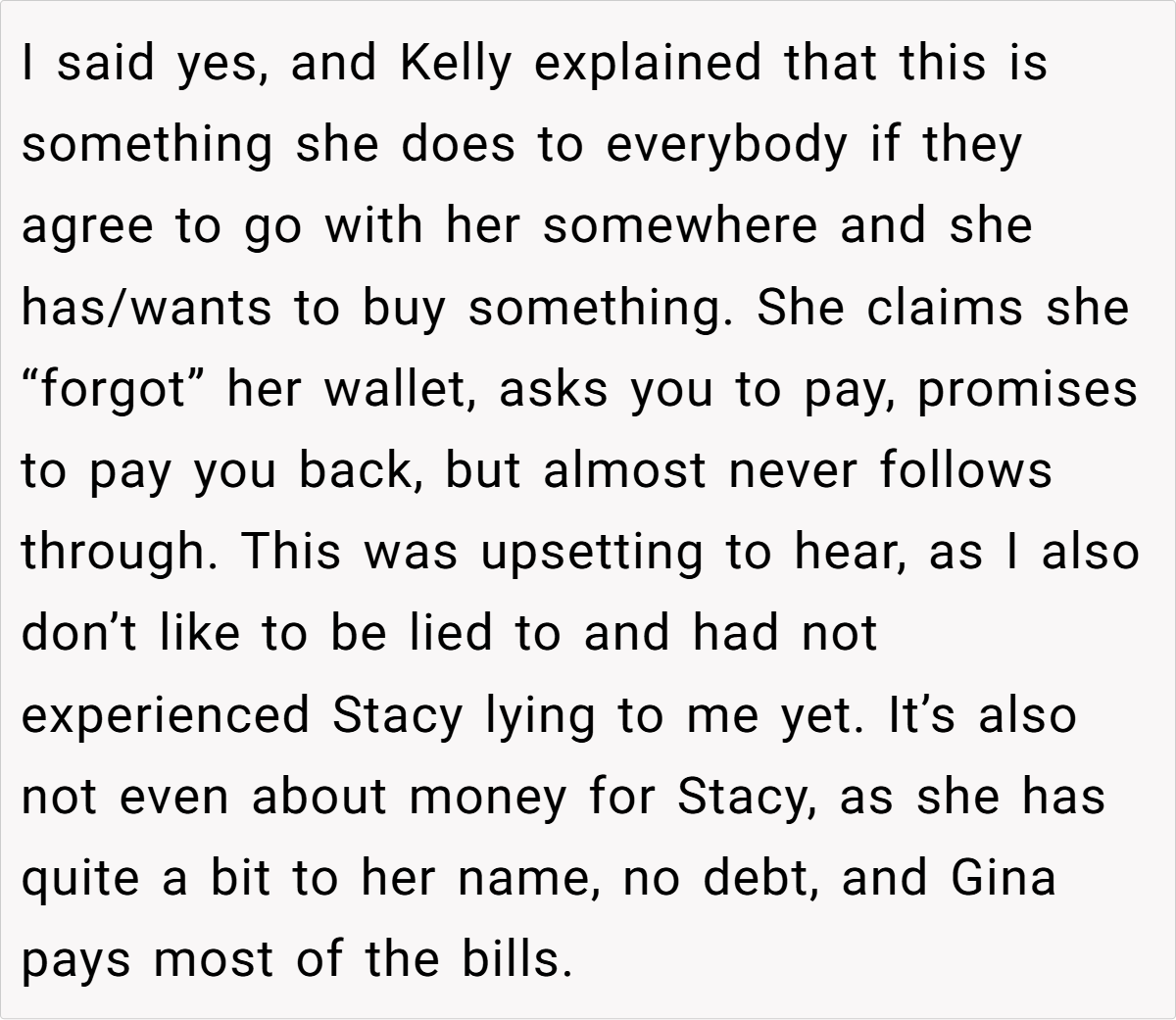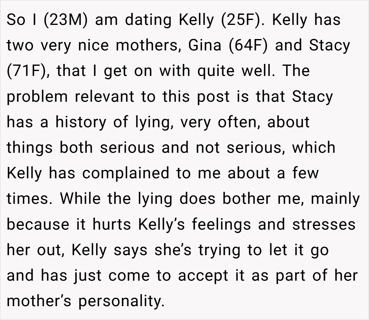 Navigating the complexities of a relationship often means dealing with family dynamics that can test even the most patient hearts. The OP, a 23-year-old man, finds himself caught in a delicate situation involving his girlfriend Kelly’s mother, Stacy. Despite Stacy’s advanced age, her habitual dishonesty—particularly when it comes to “forgetting” her wallet during errands—has long been a source of frustration for both the OP and Kelly. Although Kelly has learned to accept her mother’s fibs as part of her personality, the OP’s tolerance hit a limit when he was forced to pay for Stacy’s forgotten items yet again.