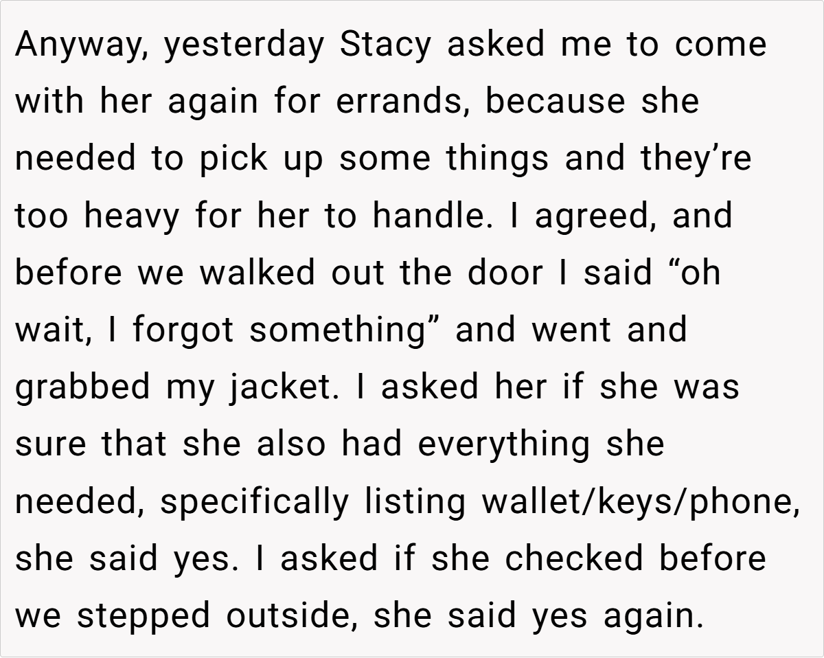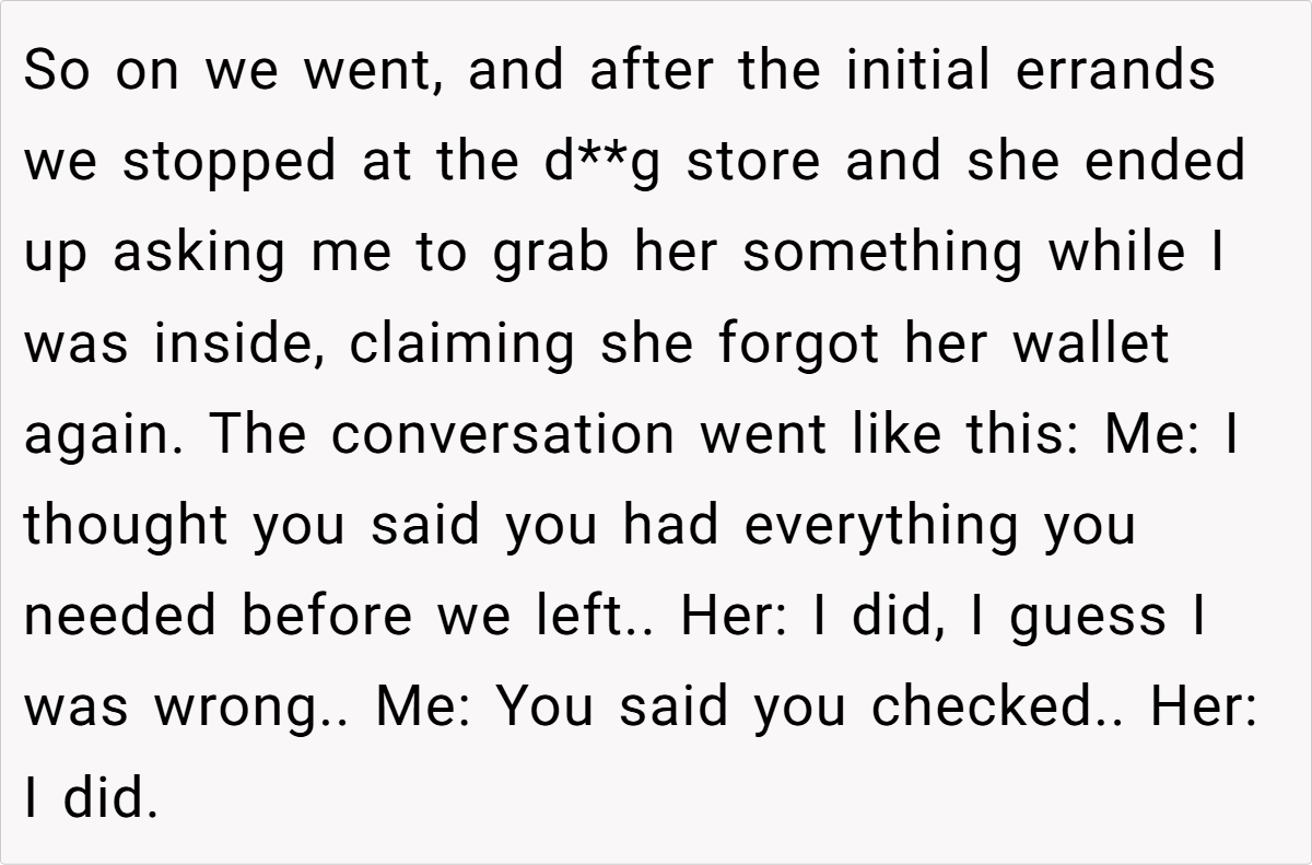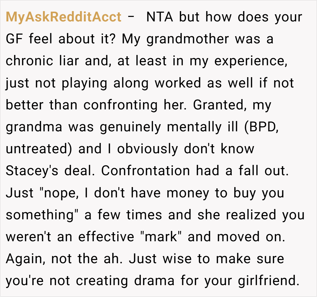 Navigating the complexities of a relationship often means dealing with family dynamics that can test even the most patient hearts. The OP, a 23-year-old man, finds himself caught in a delicate situation involving his girlfriend Kelly’s mother, Stacy. Despite Stacy’s advanced age, her habitual dishonesty—particularly when it comes to “forgetting” her wallet during errands—has long been a source of frustration for both the OP and Kelly. Although Kelly has learned to accept her mother’s fibs as part of her personality, the OP’s tolerance hit a limit when he was forced to pay for Stacy’s forgotten items yet again.
