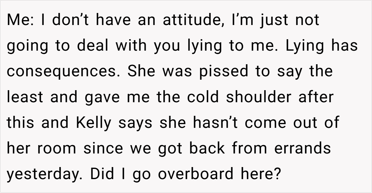 The breaking point came during a recent errand run, when a heated confrontation ensued over Stacy’s repeated false assurances. In an attempt to set a firm boundary, the OP bluntly stated, “Lying has consequences.” While this declaration was meant to address a recurring pattern of deceit, it sparked a fallout that has left both Stacy and Kelly upset. The incident raises important questions about honesty, respect, and the impact of confronting long-standing behavior in family relationships.