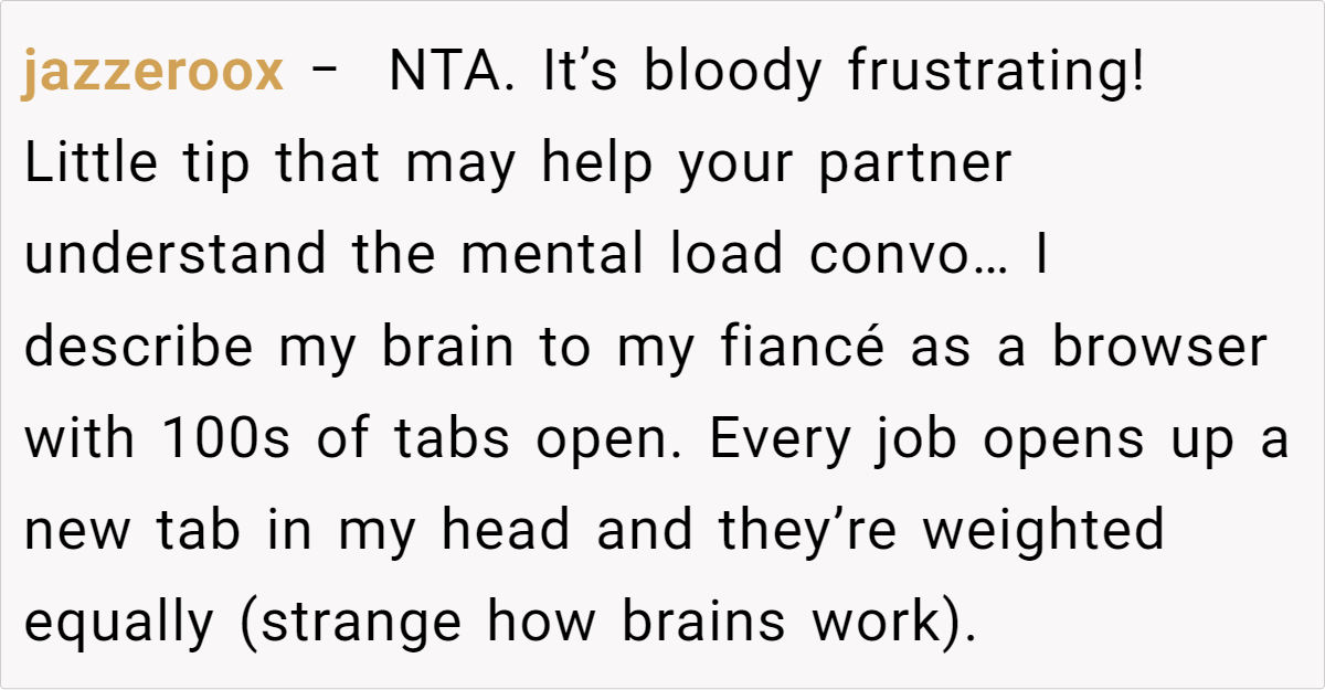 The Reddit community largely sided with the wife, commending her for calling attention to the mental load that often goes unnoticed. Many likened the experience to having “hundreds of browser tabs open” and stressed that even small questions can contribute to overwhelming stress.