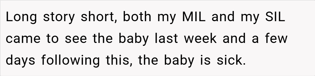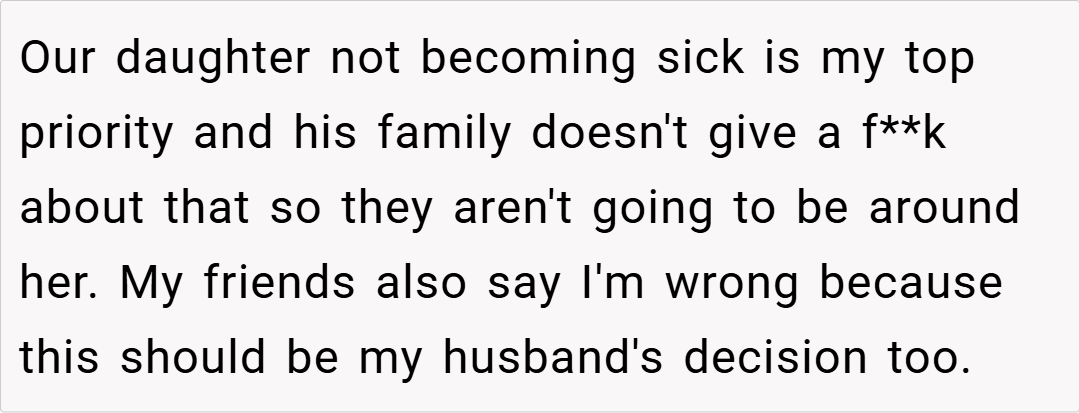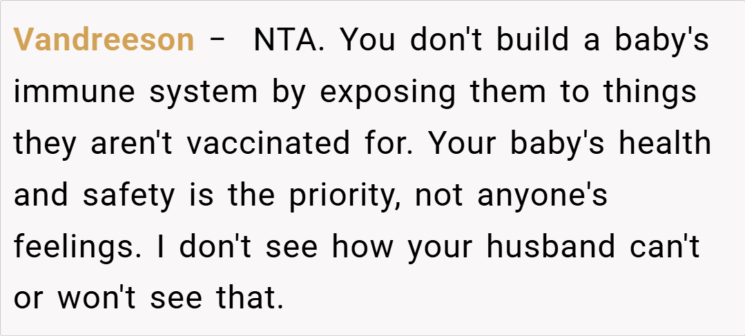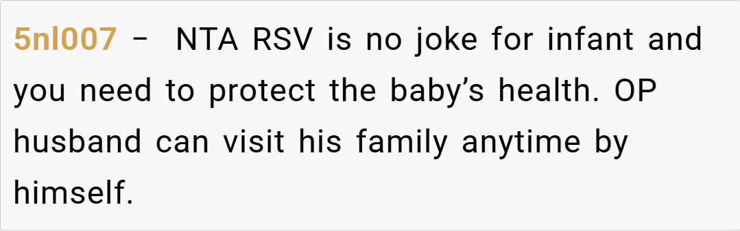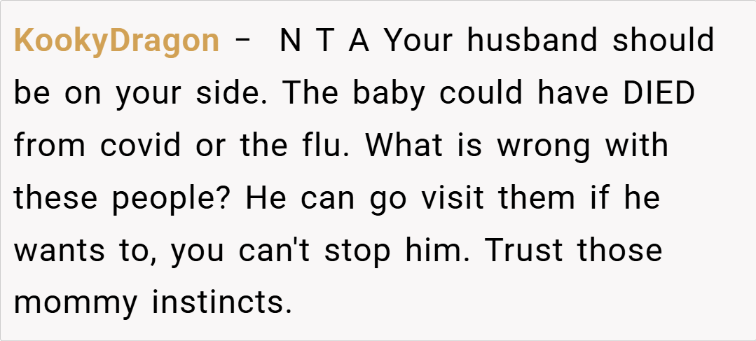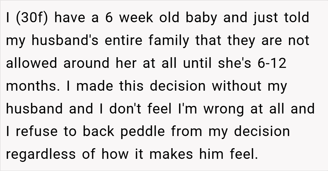 In the end, the decision to restrict access to a newborn for the sake of health isn’t made lightly. The OP’s choice to bar her husband’s family until her baby is 6 to 12 months old reflects a deep commitment to protecting her child in an uncertain world. While it has sparked significant conflict—especially with a husband who values family connections—this move is rooted in a pragmatic, if tough, approach to parenting.