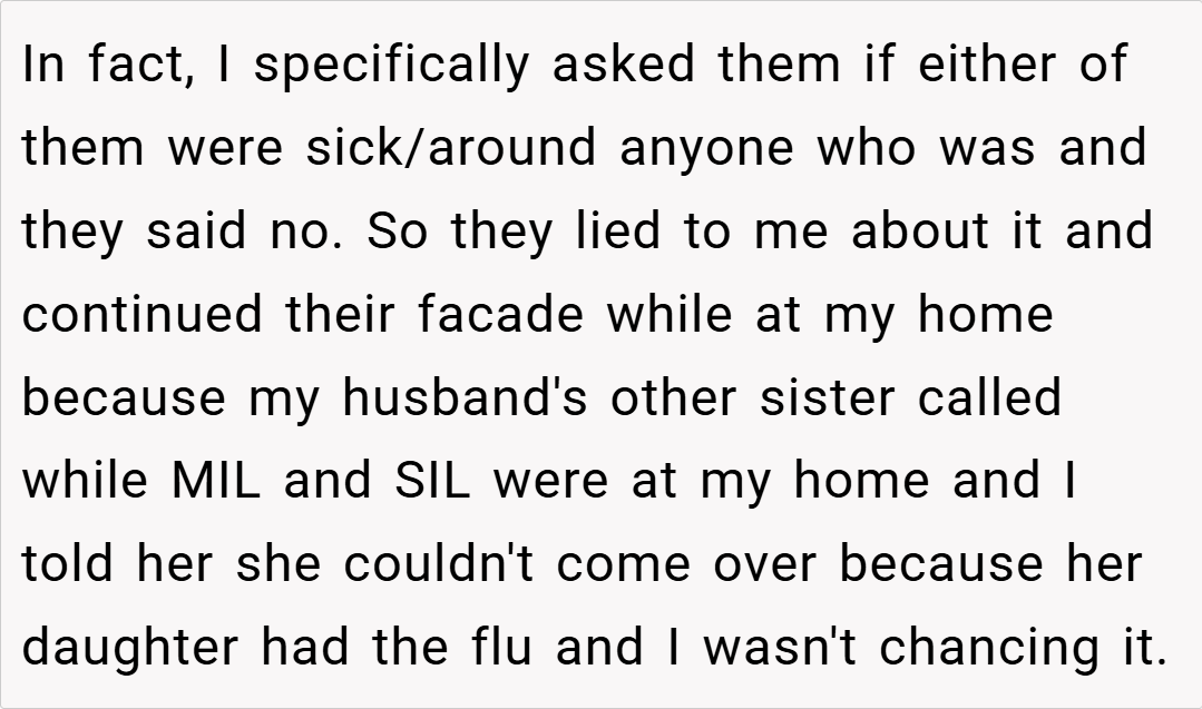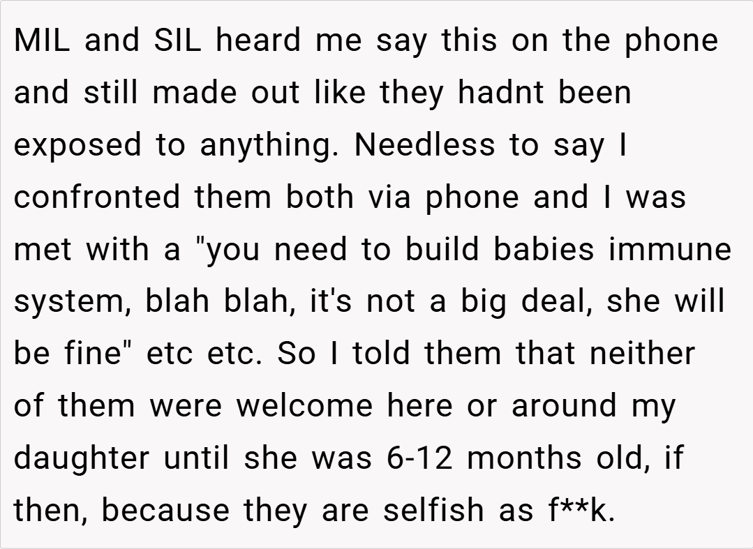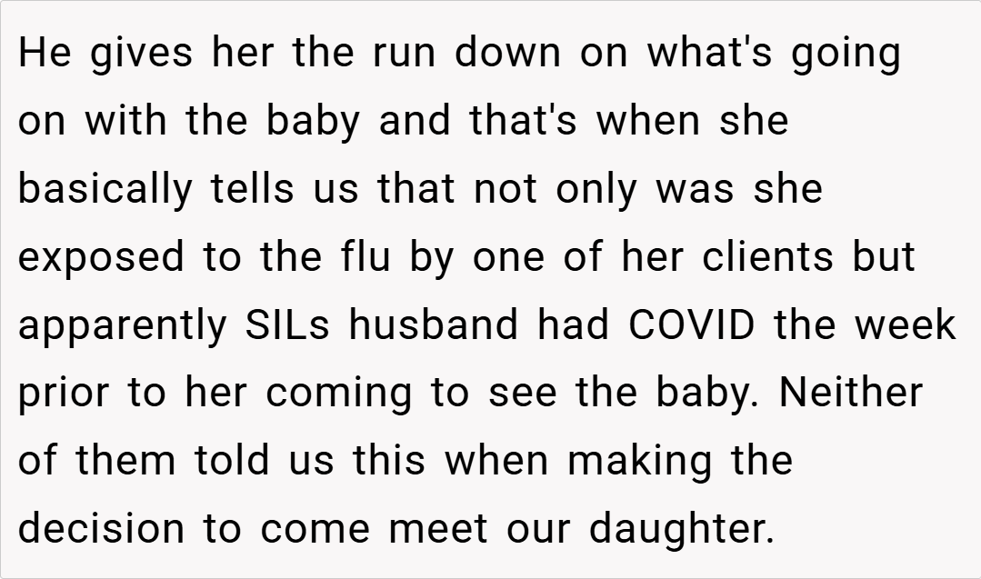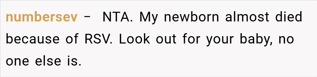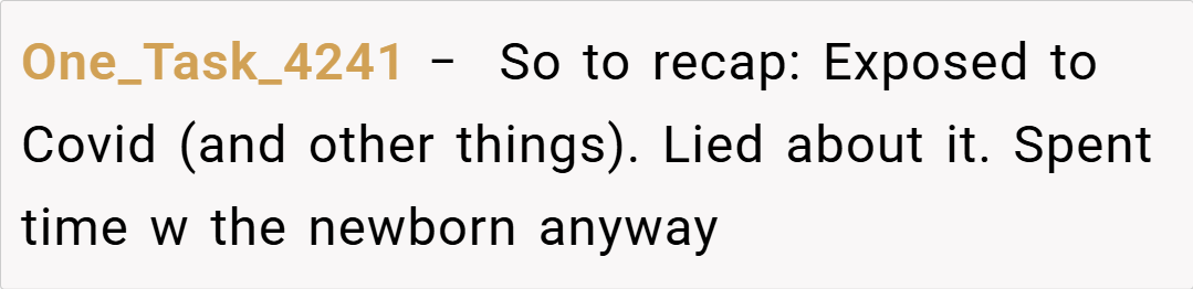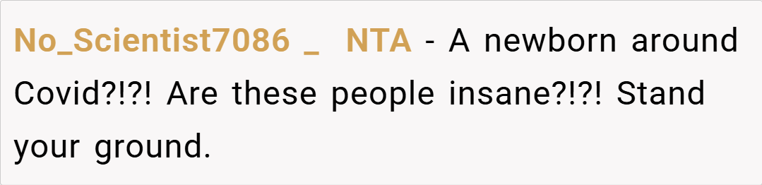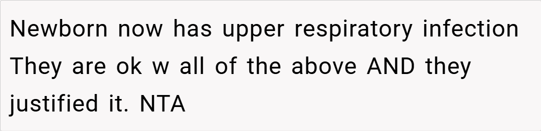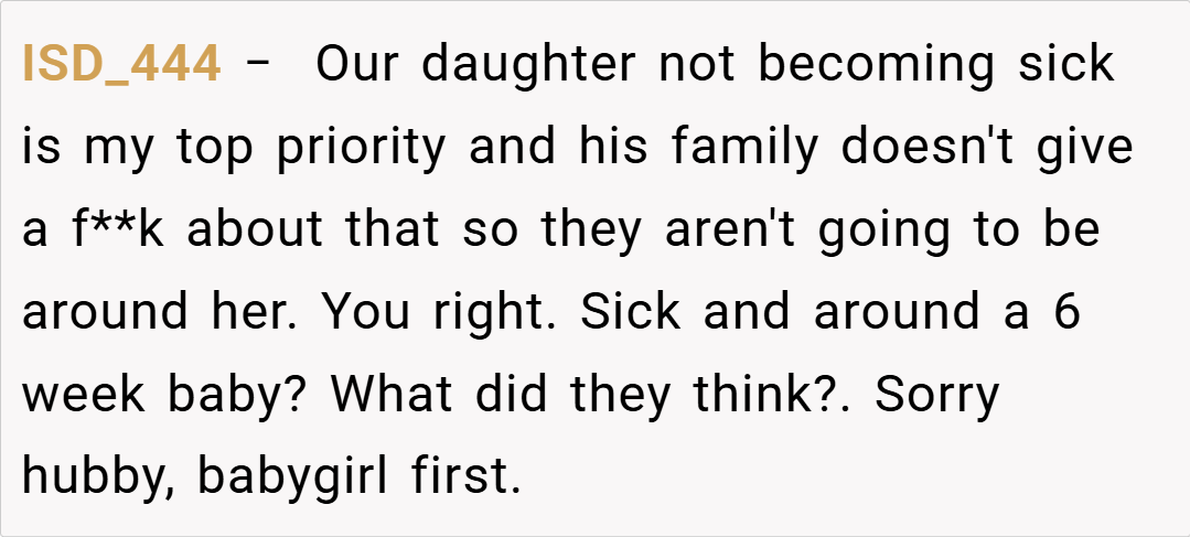Many redditors agree with the OP’s decision, emphasizing that protecting a newborn’s health should be a top priority. They note that when family members are not forthcoming about their recent exposures to illness, setting boundaries is not only reasonable but necessary. One redditor commented, “In these uncertain times, if you’re not transparent about your health, you’re putting a baby at risk—and that’s just not acceptable.”