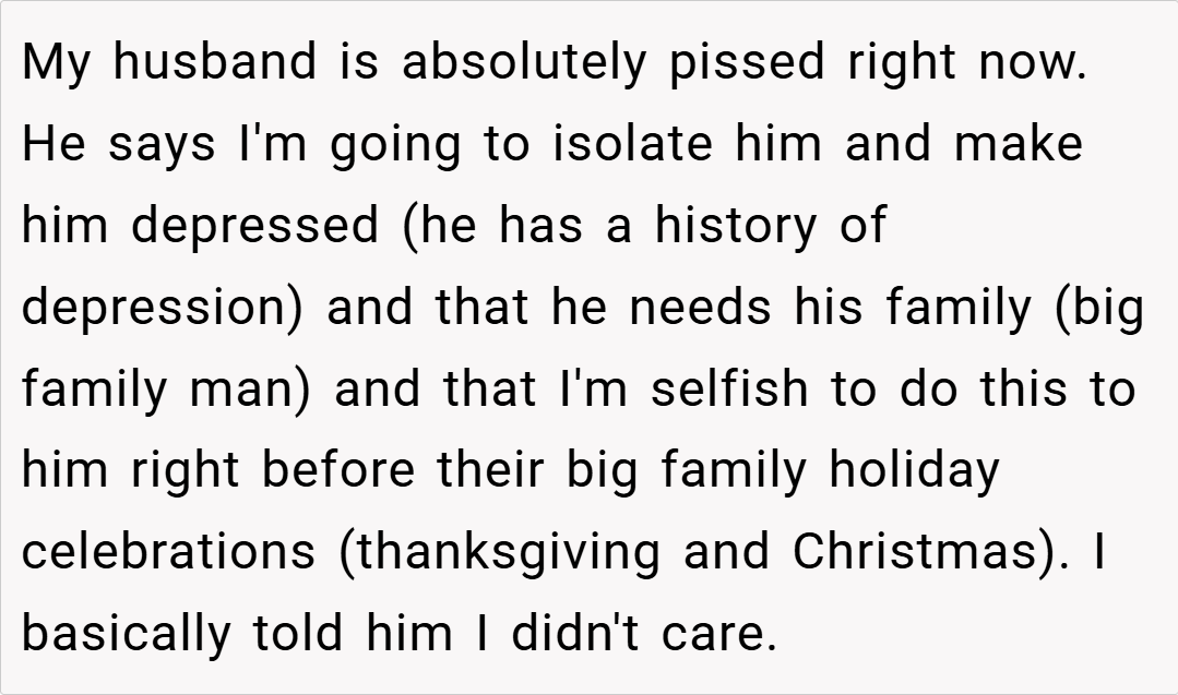 Even though her husband, a big family man with a history of depression, is upset about the impending isolation from his loved ones—especially with big holidays like Thanksgiving and Christmas looming—the OP remains resolute. She insists that the safety and health of her daughter trump all other concerns. The question now is: is she being overly harsh, or is her protective instinct justified?