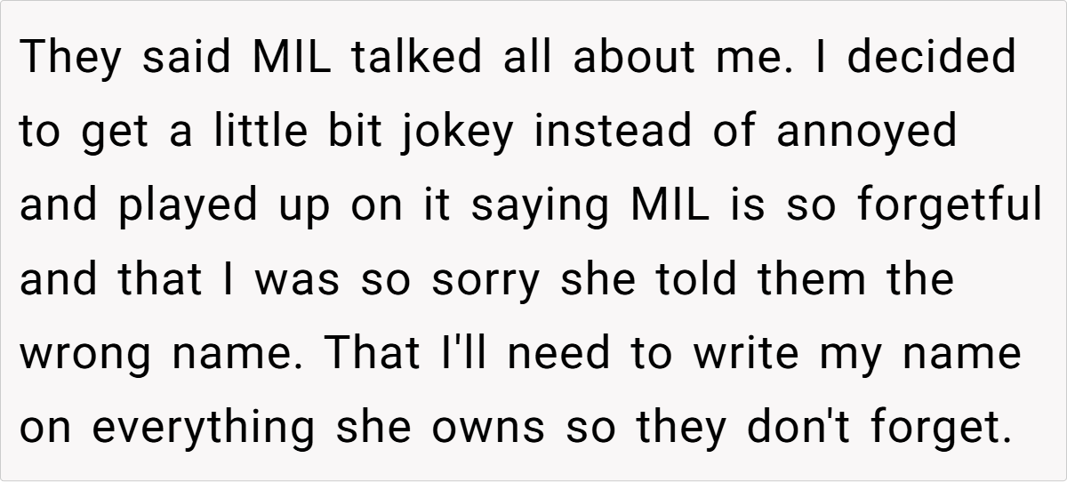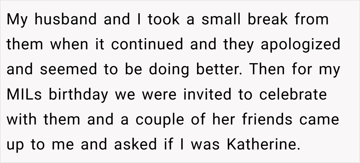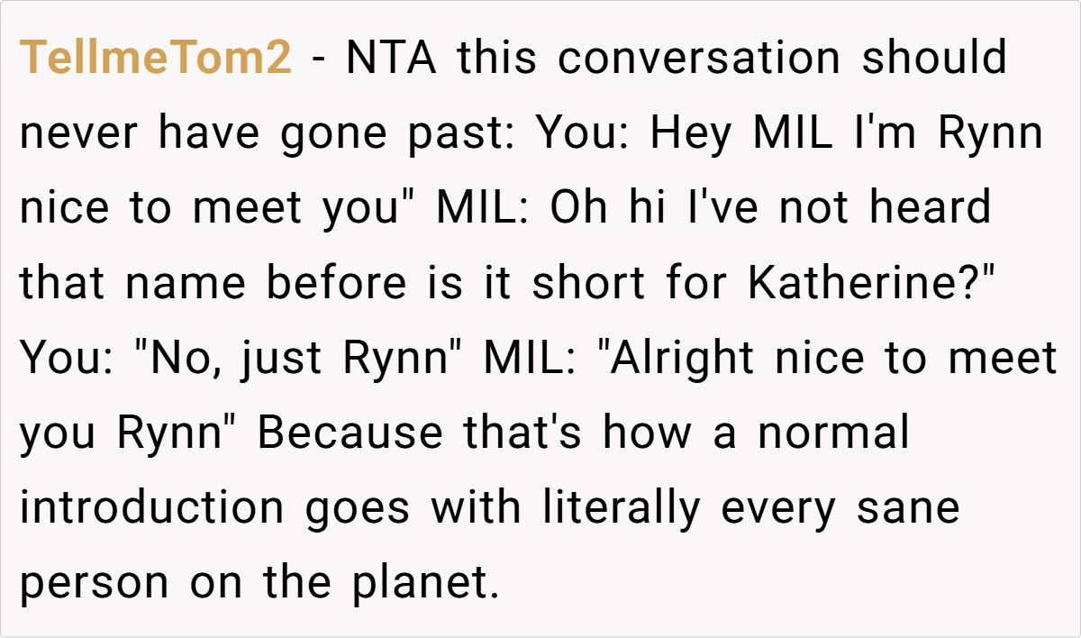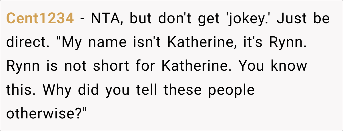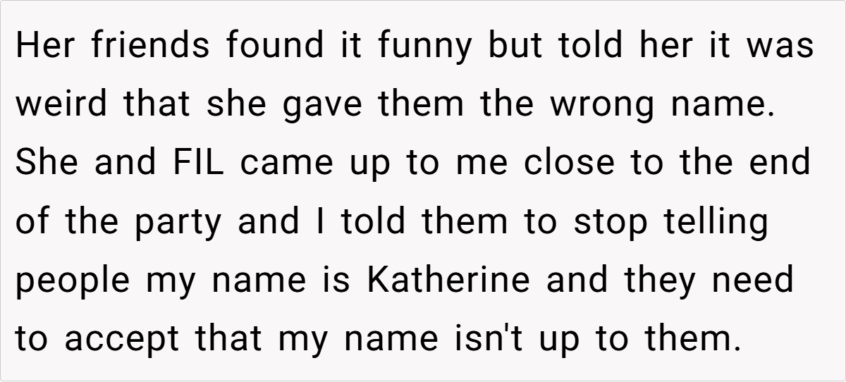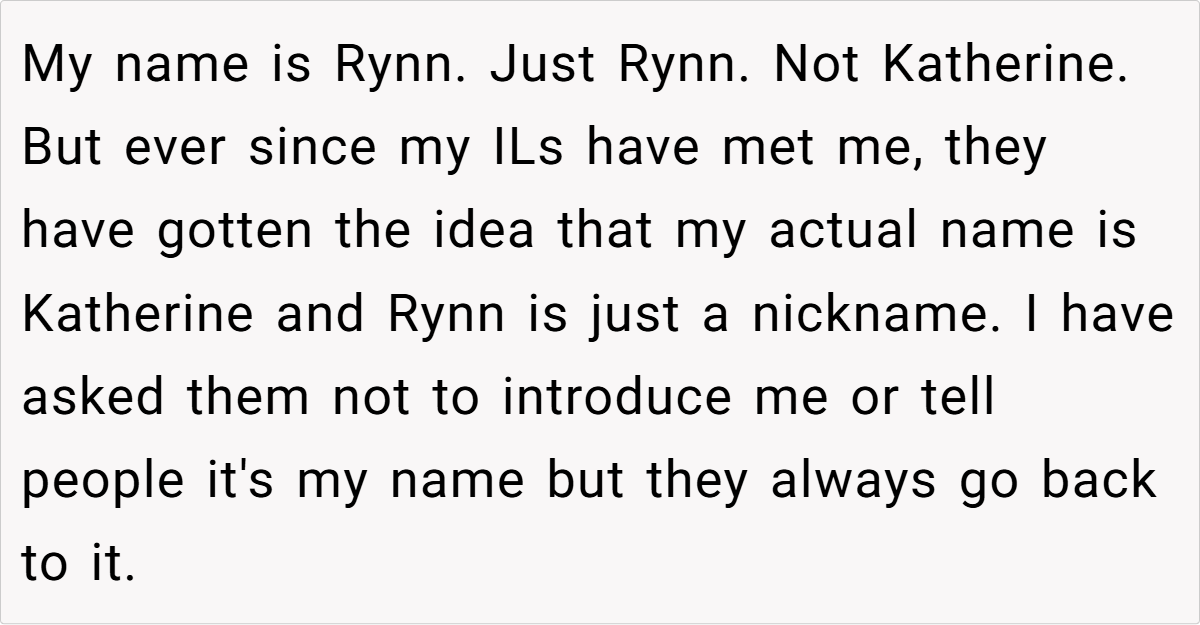 OP, whose name is Rynn—not Katherine—has repeatedly told her in-laws to stop introducing her as Katherine. Despite their apologies after a previous confrontation, OP recently discovered they were still telling people her name was Katherine at a family gathering. Rather than reacting in frustration, she took a lighthearted approach, jokingly suggesting that MIL must be forgetful.