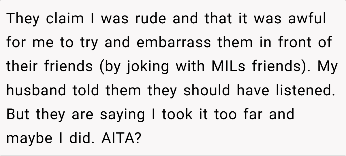 MIL’s friends found it funny, but MIL and FIL were furious, claiming OP embarrassed them. Now, OP is questioning whether she took things too far. But is she really in the wrong, or are her in-laws just refusing to respect her identity?