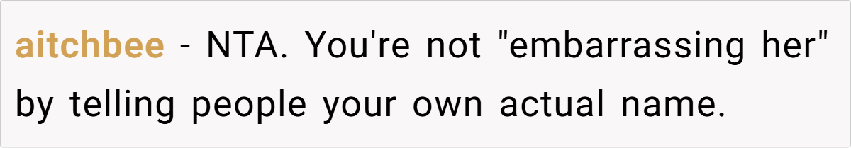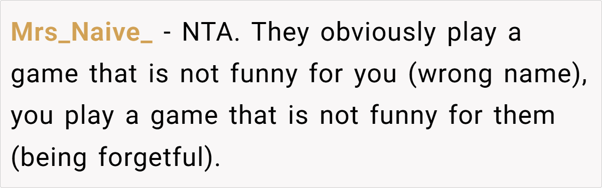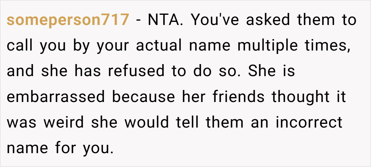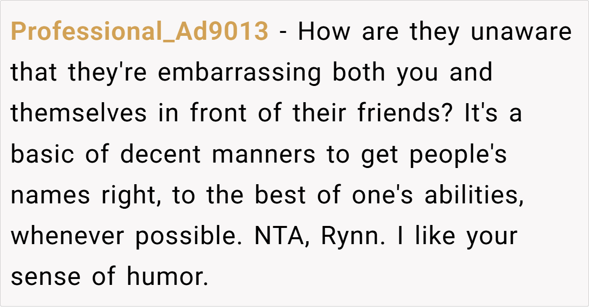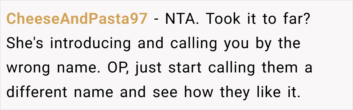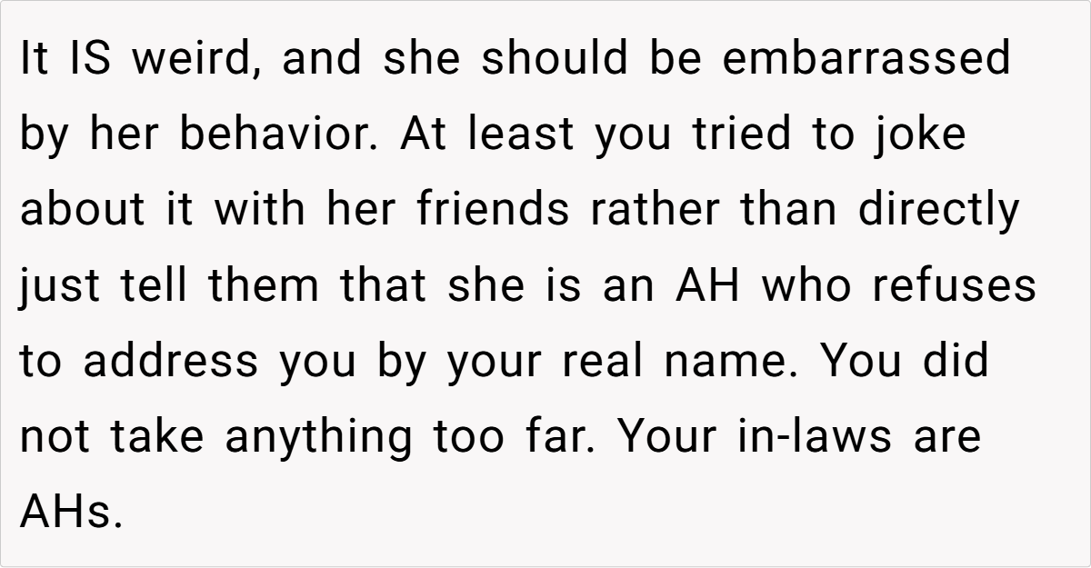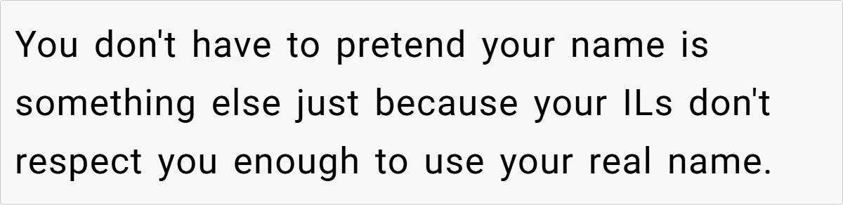 OP’s response was both humorous and justified, yet her in-laws’ continued refusal to acknowledge her real name suggests a deeper issue of control and respect. Names matter, and being called the right one is a basic form of courtesy. What do you think? Should OP continue standing her ground, or was her response too far?