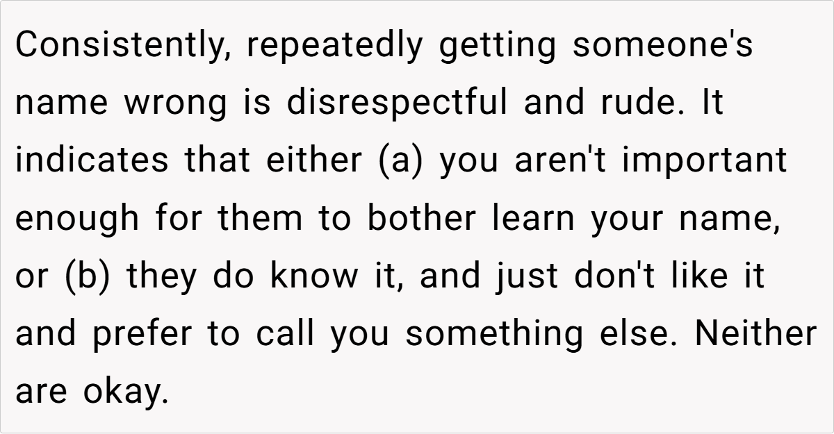 Dr. Laura Namey, an expert in social dynamics, states: “A name is deeply tied to self-identity. Continual misnaming, especially after repeated corrections, is a sign of power imbalance. If someone refuses to use your real name, they are, in a way, refusing to acknowledge you on your own terms.”