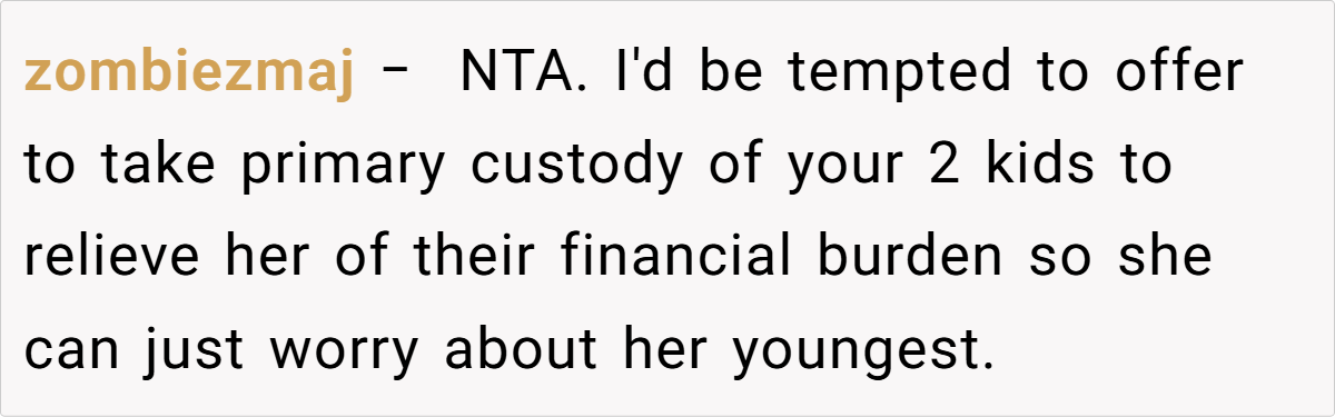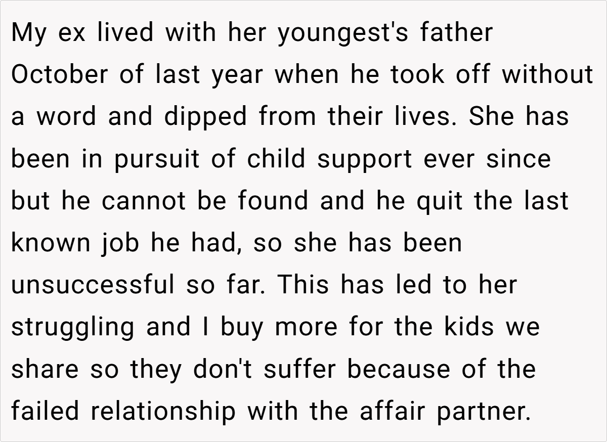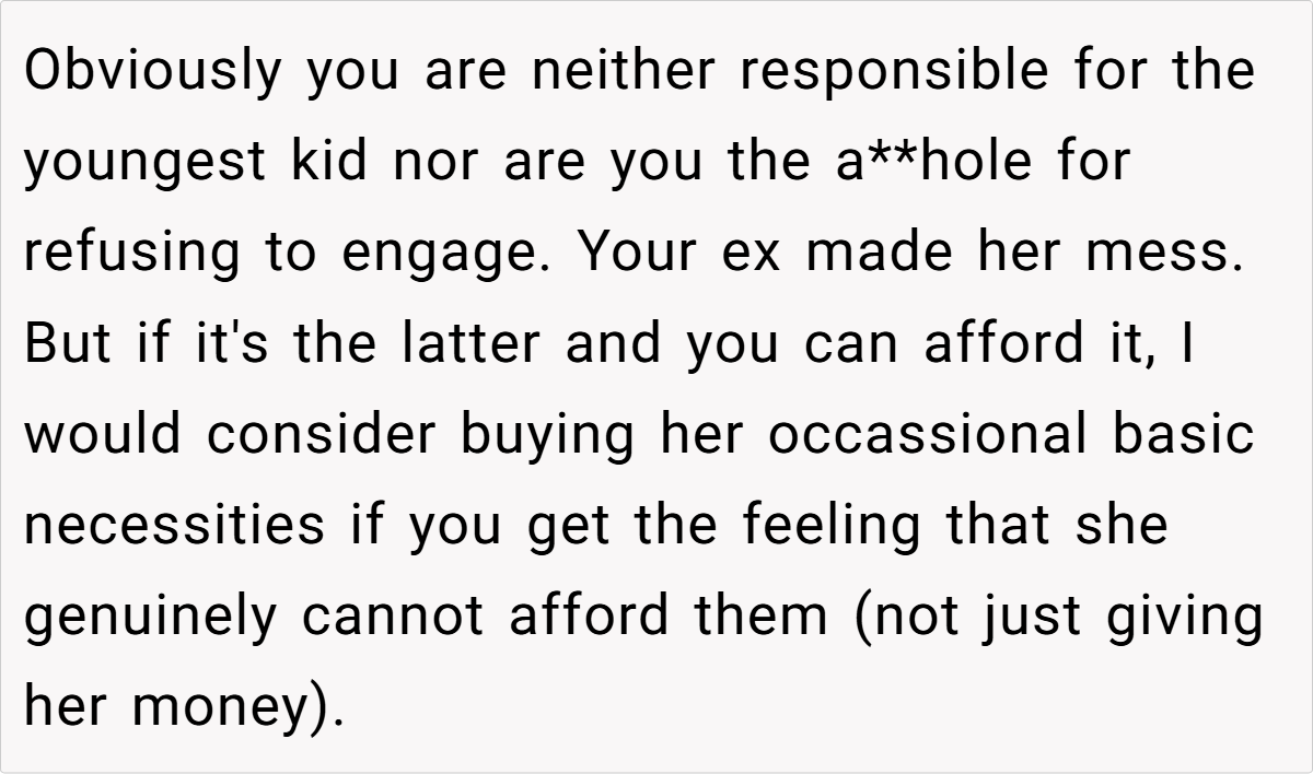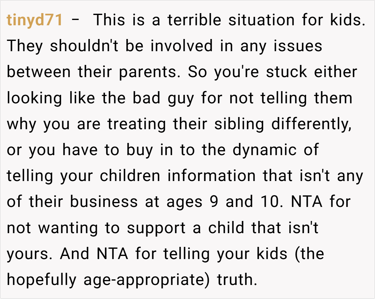 Others, however, suggest that a more gentle explanation might have mitigated the hurt feelings involved. Still, the prevailing view is that a parent’s primary duty is to protect and provide for their own children, and that financial responsibility should not be extended simply because of shared living arrangements or familial obligations, especially when the situation originates from past infidelity.
