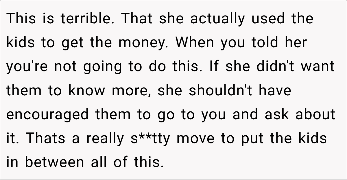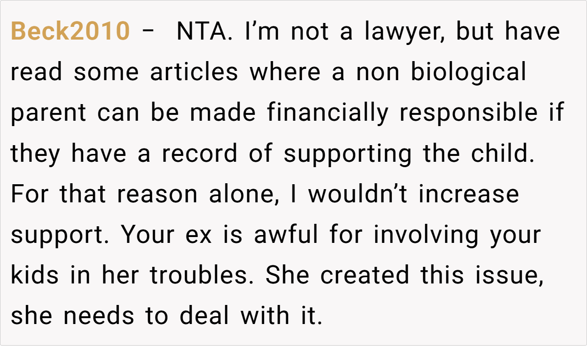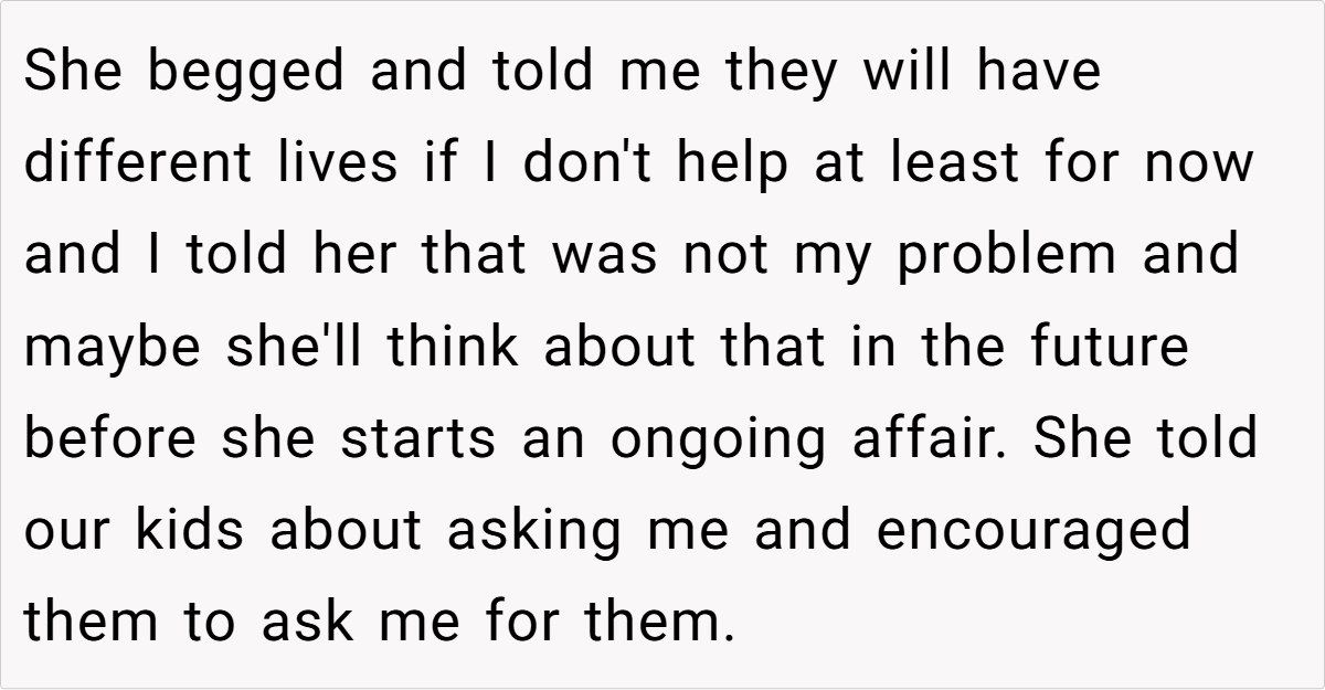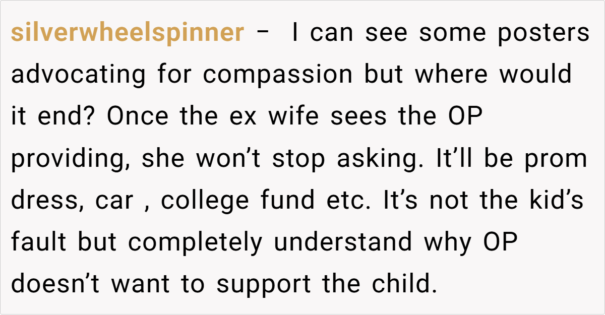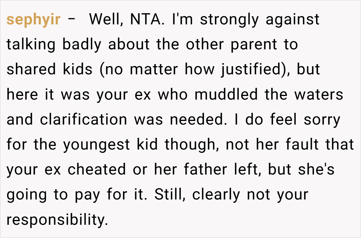 Others, however, suggest that a more gentle explanation might have mitigated the hurt feelings involved. Still, the prevailing view is that a parent’s primary duty is to protect and provide for their own children, and that financial responsibility should not be extended simply because of shared living arrangements or familial obligations, especially when the situation originates from past infidelity.