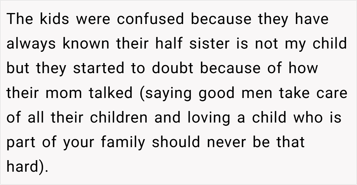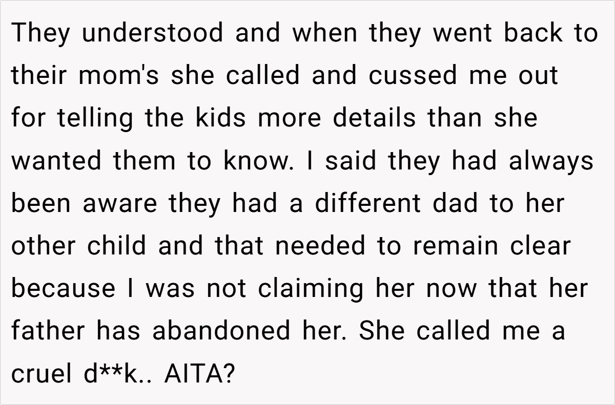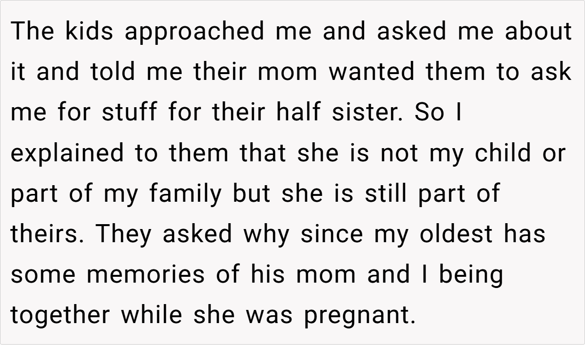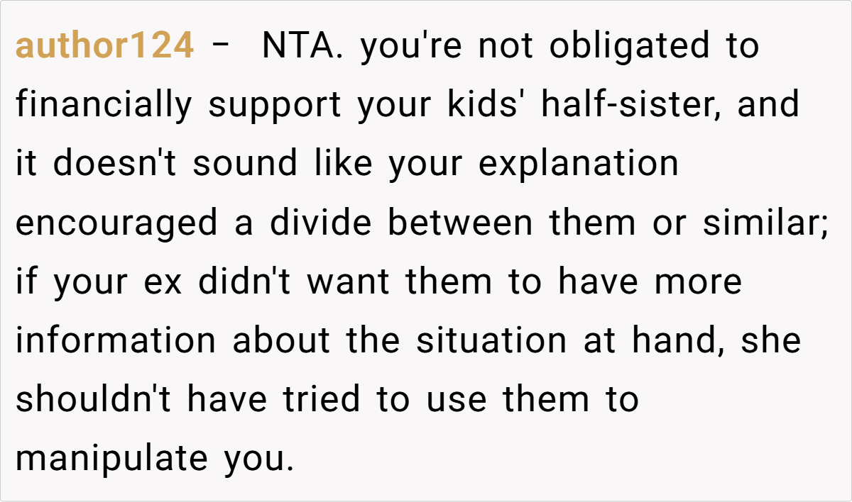 Despite having always been transparent about the half-sibling not being his biological child, the conversation took an unexpected turn when the ex-wife, struggling financially, pressured him to help out. When he firmly reiterated his stance to his kids, she lashed out, accusing him of cruelty. Now, he wonders if his honest explanation makes him the asshole or if he was right to set such clear boundaries.