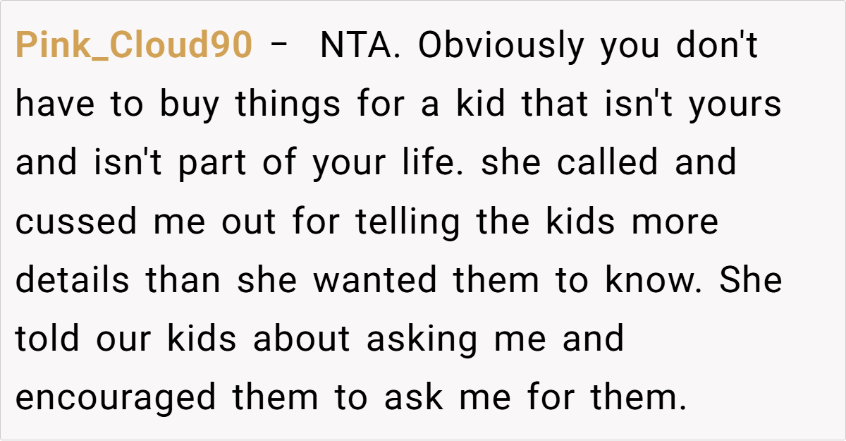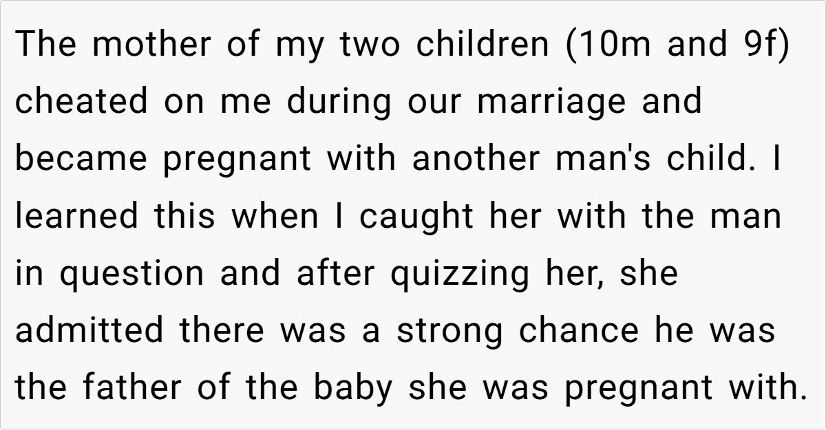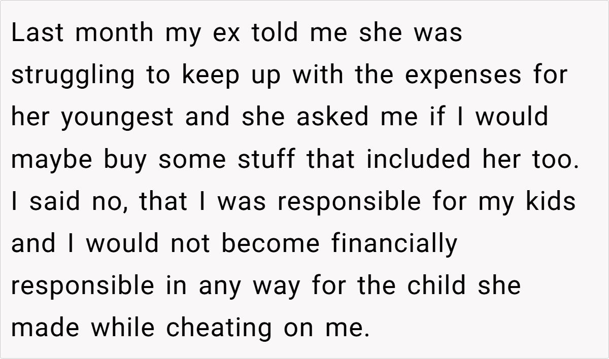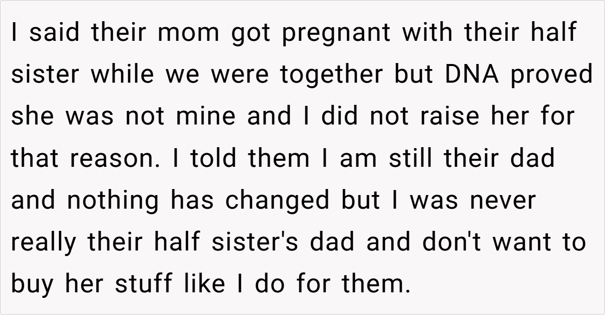 Family finances and blended relationships can be incredibly sensitive topics, especially when infidelity is involved. In this case, a father of two (10‑year‑old son and 9‑year‑old daughter) recounts how he explained to his children why he refuses to buy gifts or cover expenses for their half-sibling—the result of his ex-wife’s affair during their marriage.