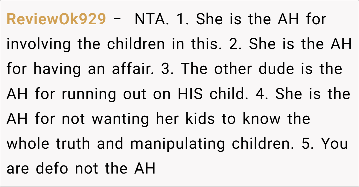 Family and relationship experts emphasize that setting clear financial and emotional boundaries is crucial in blended family situations—especially when the origins of the relationship involve infidelity. Experts like Dr. Laura Markham note, “Honesty about your values and boundaries is essential in guiding children to understand their family structure,” which applies here as the father sought to protect his own children’s best interests.