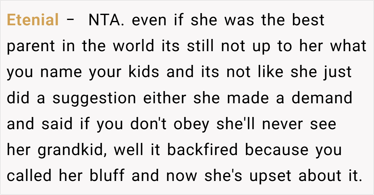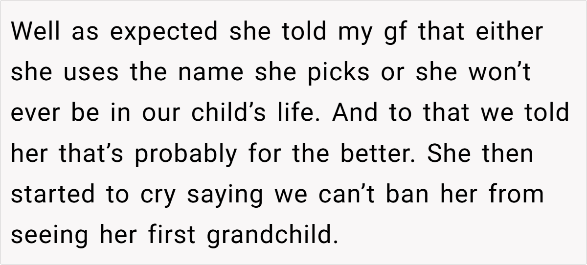 Letting your partner’s family dictate key decisions—especially when it involves your child—is a slippery slope. In this case, the confrontation over naming rights is not just about a word; it symbolizes deeper issues of control and respect. The father’s retort, “you made your bed and you can rot in it,” was not said lightly. It reflects a determination to establish clear boundaries in the face of relentless overreach, a stance that many find both commendable and necessary in toxic dynamics.
