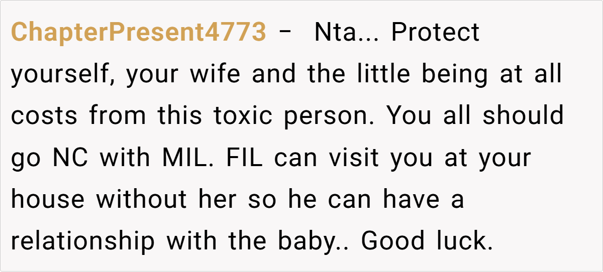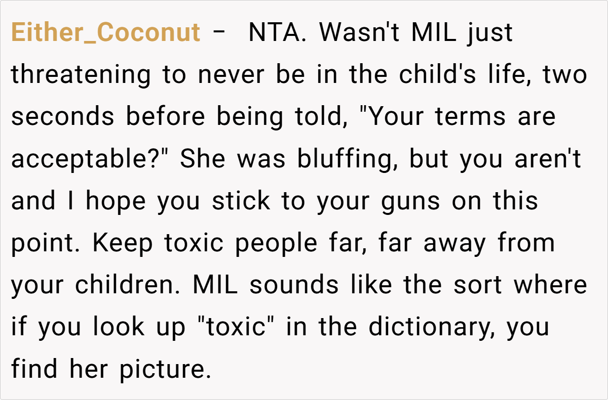 Many redditors rallied behind the couple, applauding the firm stance taken against an overbearing MIL. The comments range from witty observations to strong endorsements of setting clear boundaries, with several noting that toxic behavior should never compromise the well-being of a child.