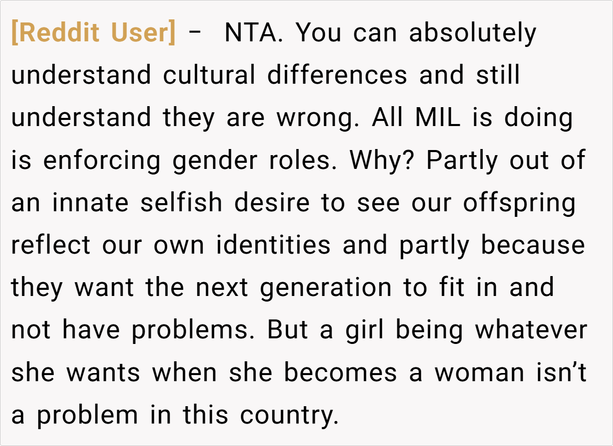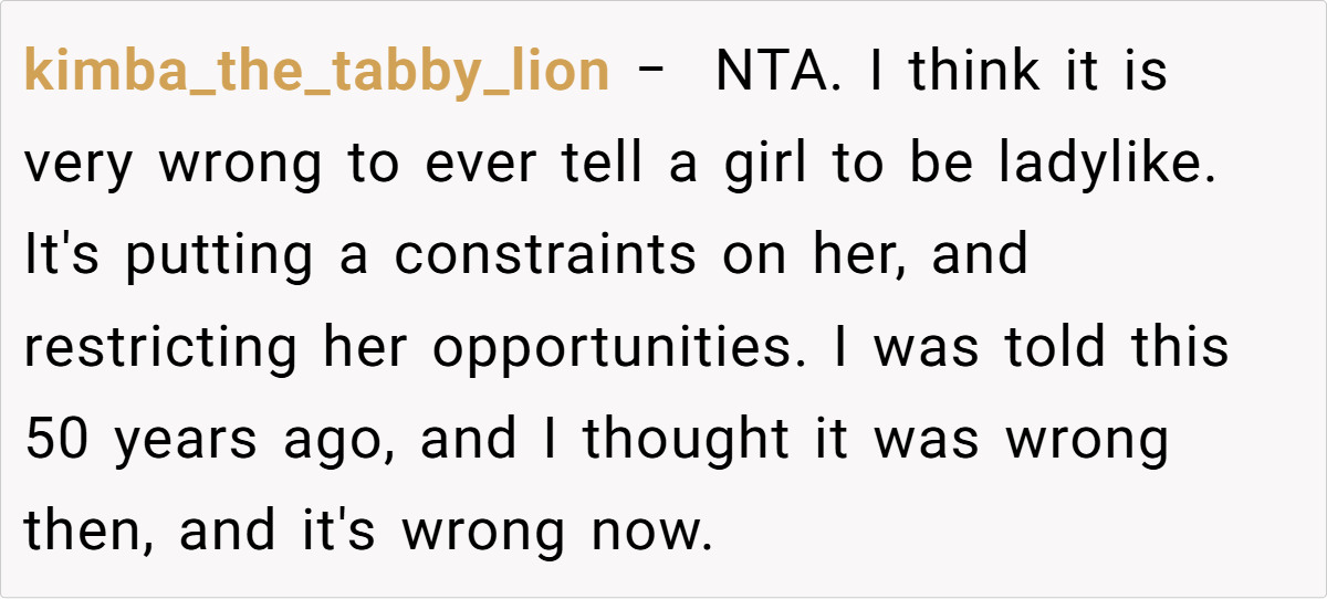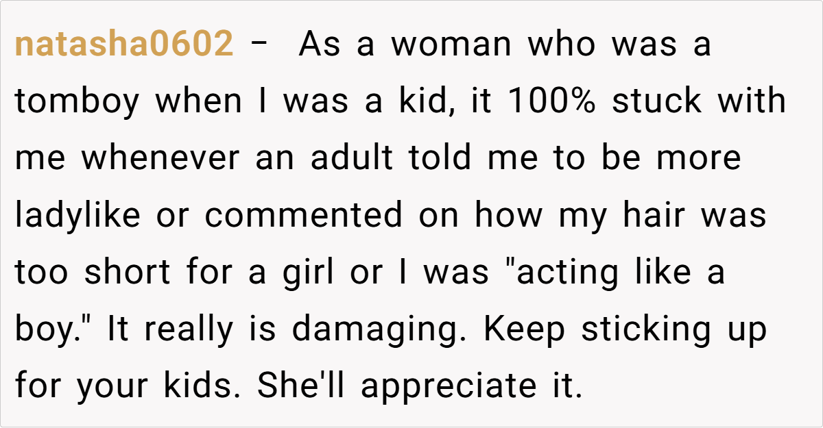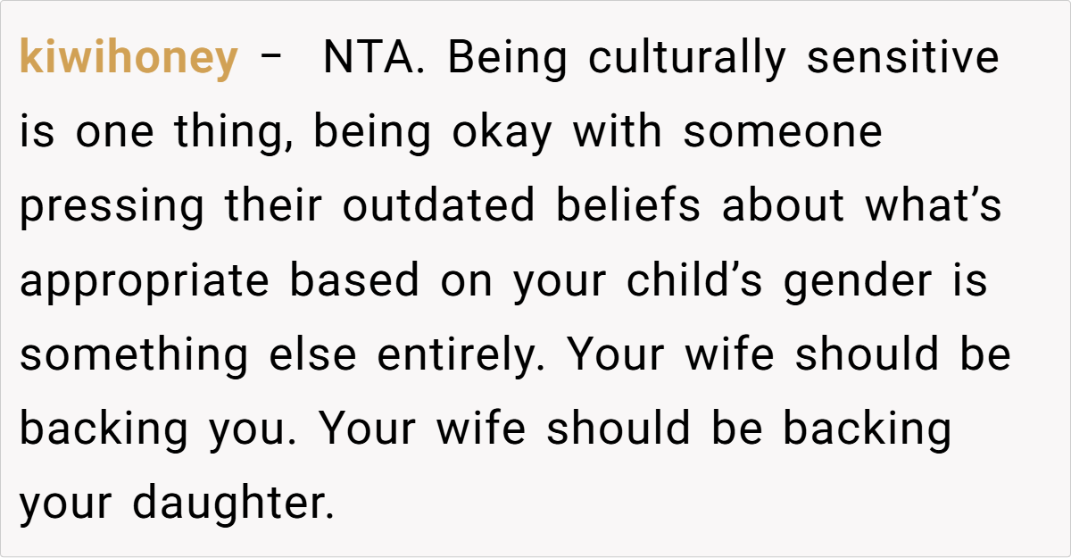 Across Reddit, the overall sentiment was one of strong support for the dad’s stance. Many users agreed that enforcing gender-specific behavior, especially by a family elder, is both outdated and unfair. The community’s consensus was clear: while cultural sensitivity is important, it should not come at the expense of a child’s right to be herself. Readers noted that the incident was less about public decorum and more about reinforcing harmful stereotypes. Ultimately, they urged families to prioritize open dialogue and mutual respect over rigid gender roles.