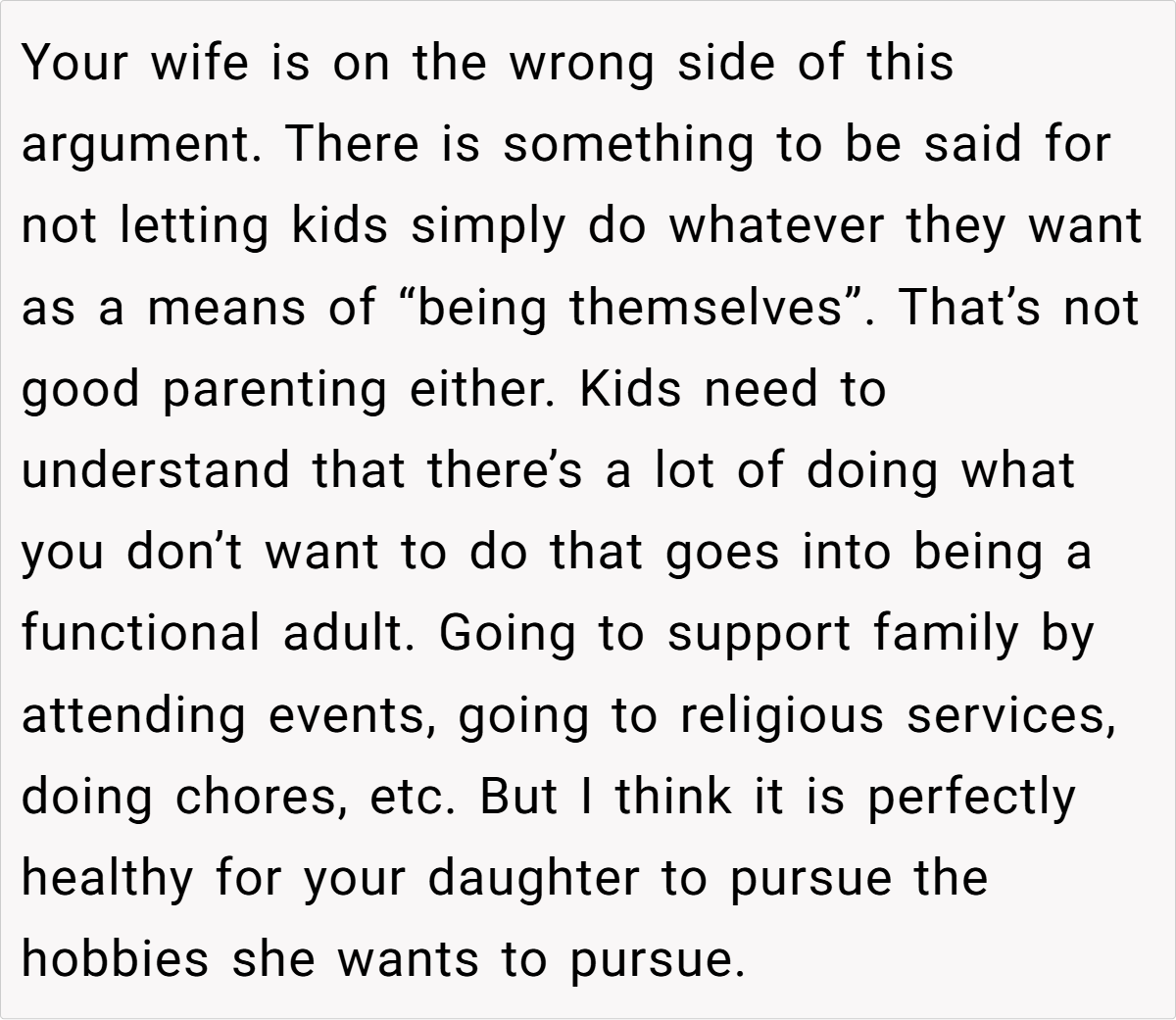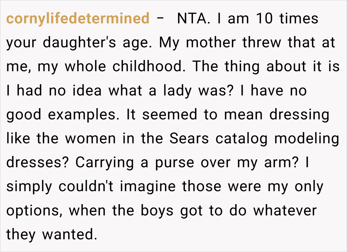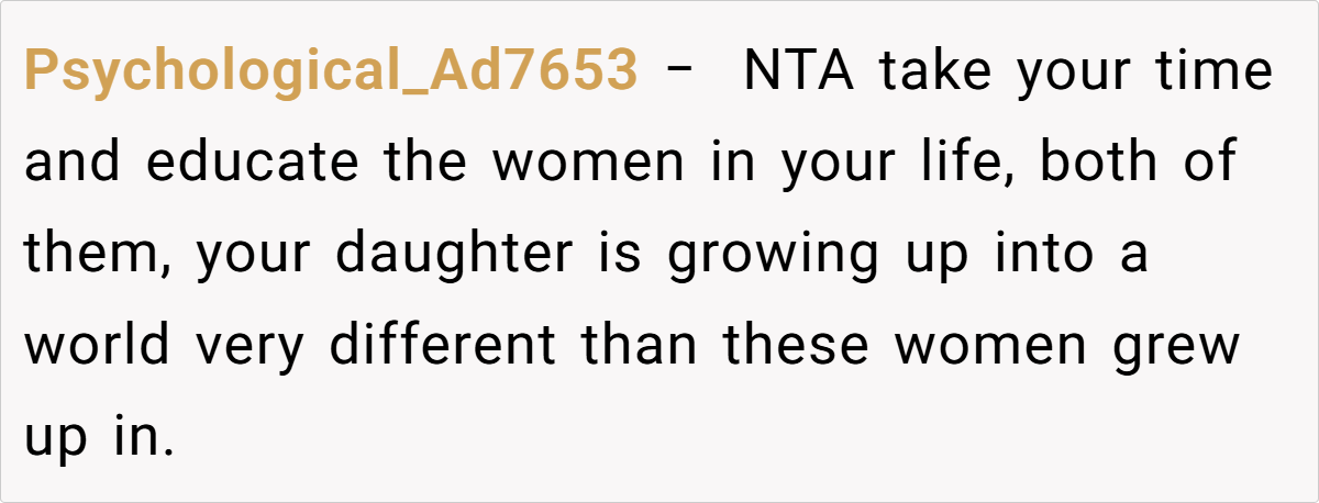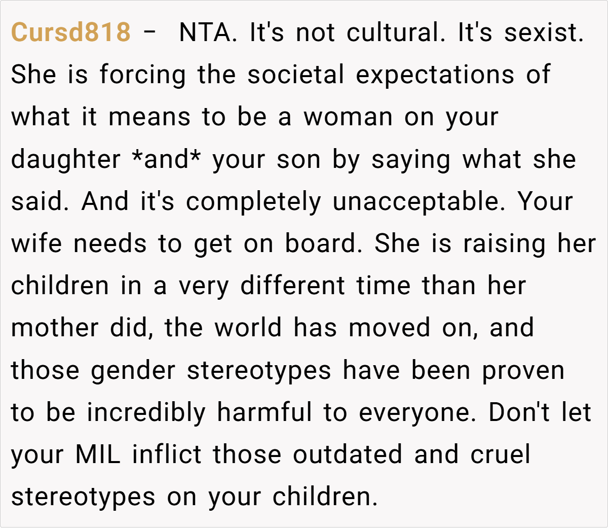 Across Reddit, the overall sentiment was one of strong support for the dad’s stance. Many users agreed that enforcing gender-specific behavior, especially by a family elder, is both outdated and unfair. The community’s consensus was clear: while cultural sensitivity is important, it should not come at the expense of a child’s right to be herself. Readers noted that the incident was less about public decorum and more about reinforcing harmful stereotypes. Ultimately, they urged families to prioritize open dialogue and mutual respect over rigid gender roles.